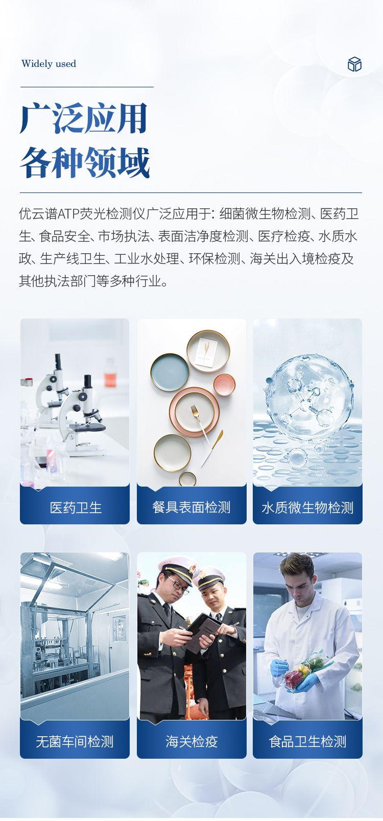 優(yōu)云譜ATP熒光檢測(cè)儀用途廣泛,可用于: 食品、醫(yī)藥衛(wèi)生、醫(yī)藥、日化、造紙、工業(yè)水處理、國防以及環(huán)保、水政、海關(guān)出入境檢疫及其他執(zhí)法部門等多種行業(yè) 。