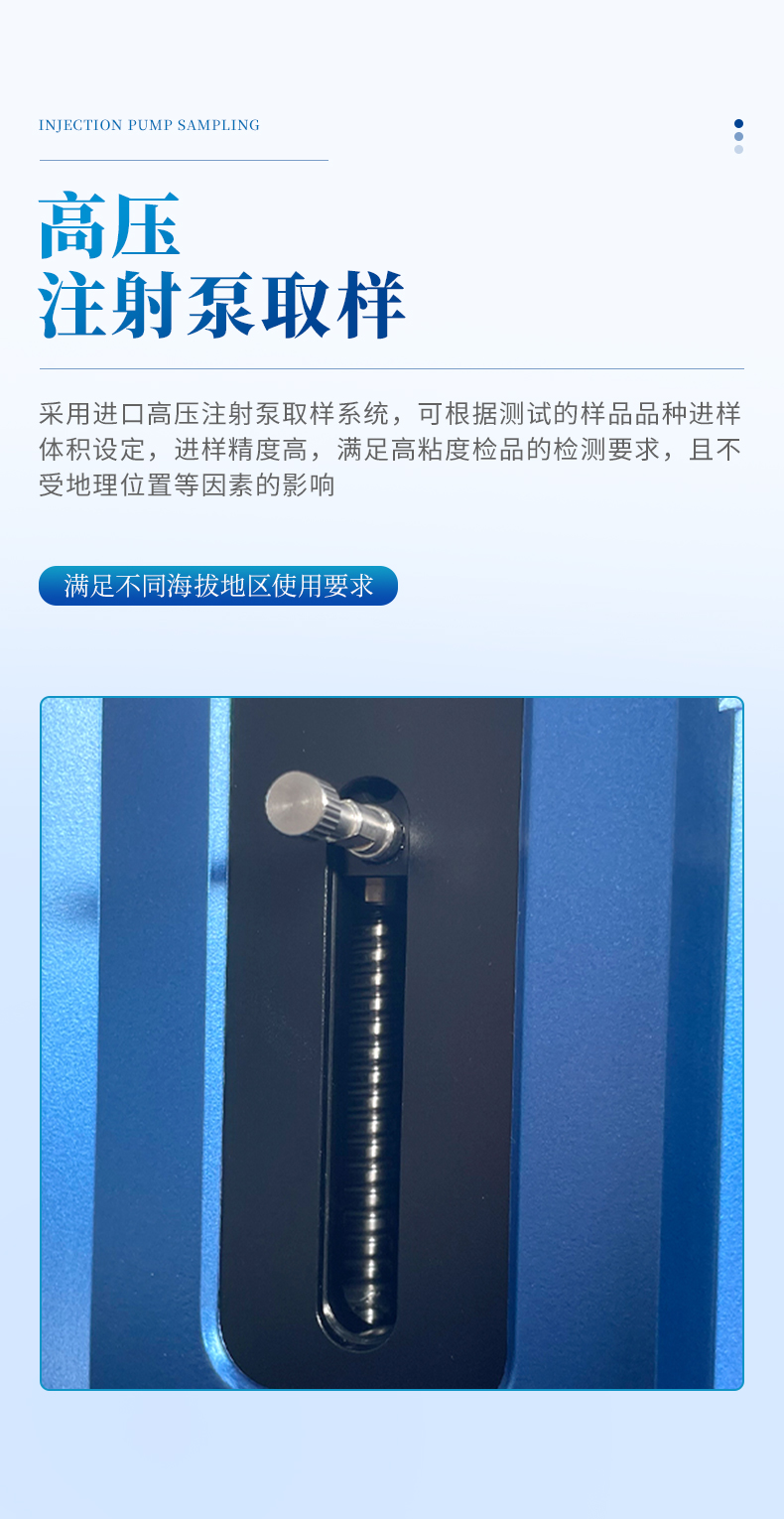 l采用進(jìn)口高壓注射泵取樣系統(tǒng),可根據(jù)測(cè)試的樣品品種進(jìn)樣體積設(shè)定,進(jìn)樣精度高,滿足高粘度檢品的檢測(cè)要求,且不受地理位置等因素的影響,滿足不同海拔地區(qū)的使用要求。