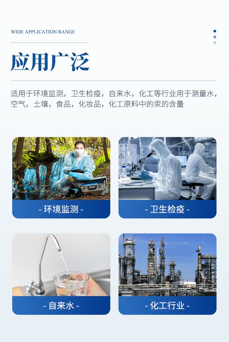 本儀器用于測量水,空氣,土壤,食品,化妝品,化工原料,中的汞的含量。同樣適用于衛(wèi)生防疫,環(huán)境監(jiān)測,化工,自來水等行業(yè)。