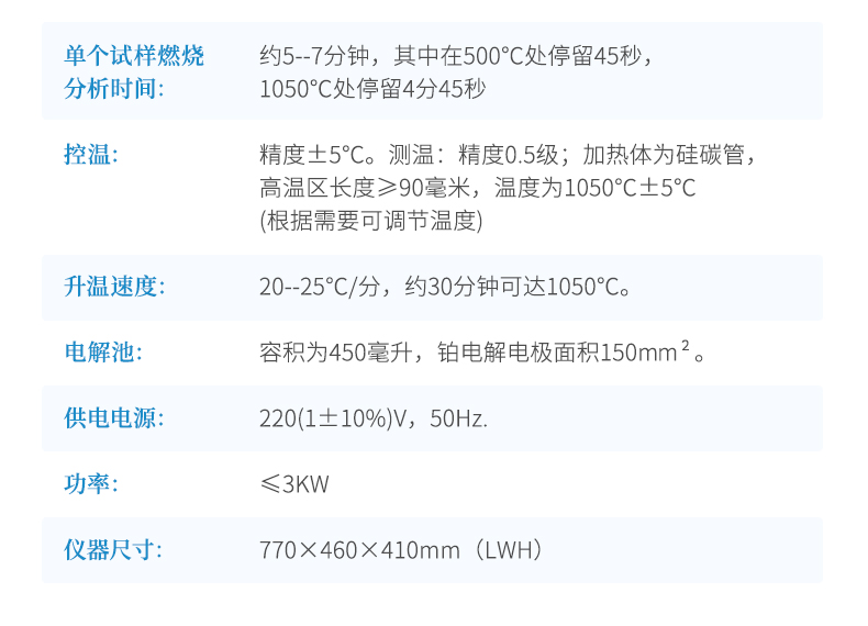 2.單個試樣燃燒分析時間:約5--7分鐘,其中在500℃處停留45秒,1050℃處停留4分45秒。