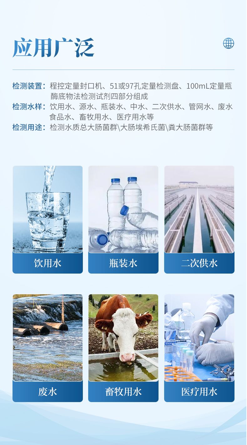 用于水樣中的總大腸菌群、糞(耐熱)大腸菌群、大腸埃希氏菌的快速檢測、可野外攜帶、應(yīng)急、定量檢測。