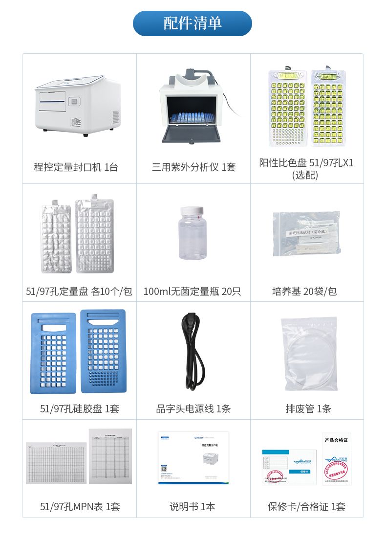 符合GB5750-2006《生活飲用水標(biāo)準(zhǔn)檢驗方法》固定底物技術(shù)酶底物法的MMO-MUG培養(yǎng)基配套使用程控定量封口機(jī),檢測水樣用(51孔定量盤)或(97孔定量盤)封裝。