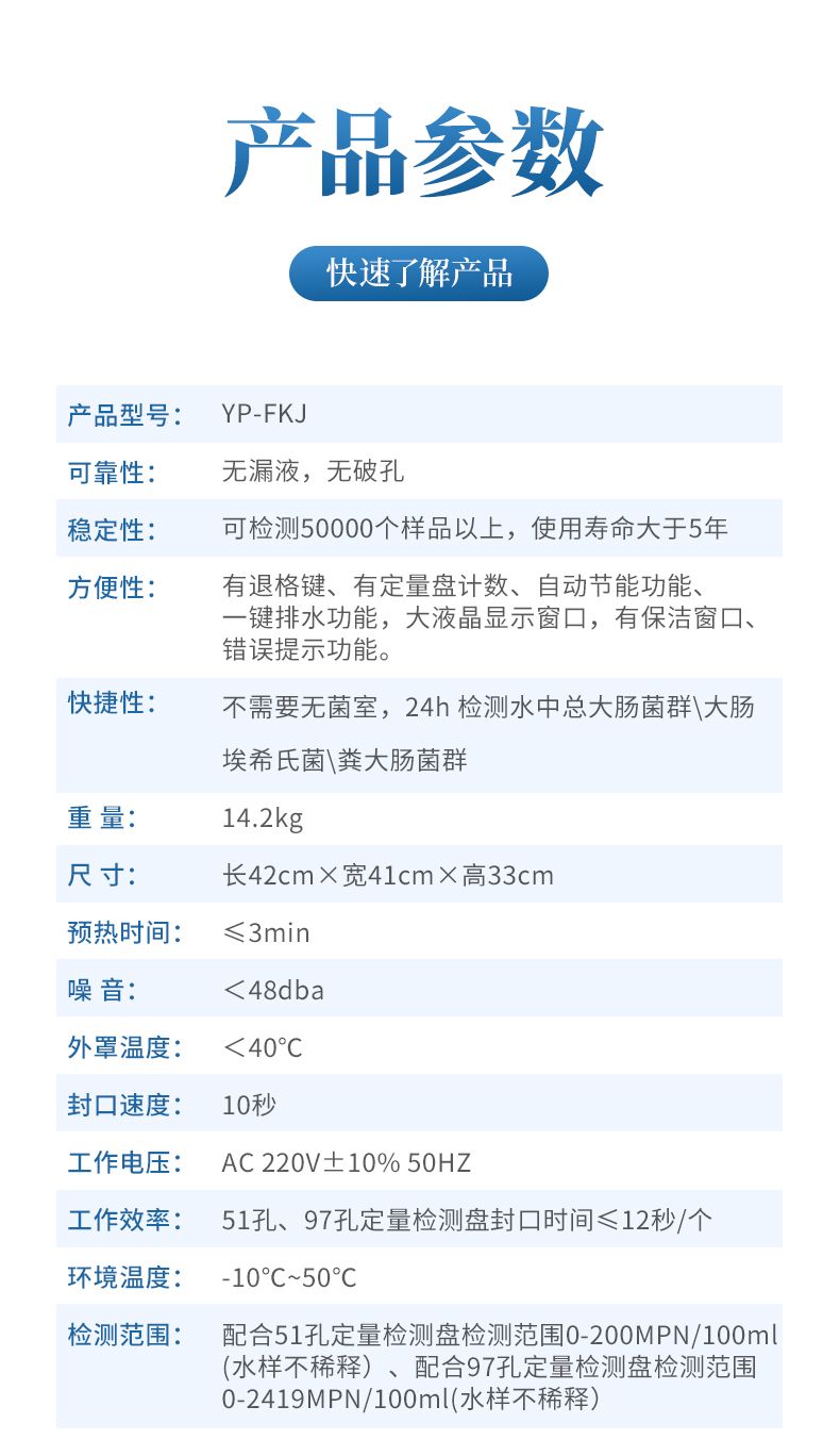 檢測范圍:配合51孔定量檢測盤檢測范圍0-200MPN/100ml (水樣不稀釋)、配合97孔定量檢測盤檢測范圍0-2419MPN/100ml(水樣不稀釋)