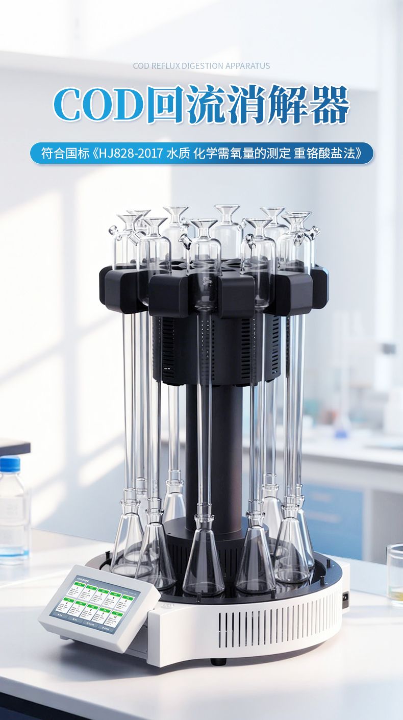 化學(xué)需氧量(COD)智能回流消解器遵循了國(guó)家標(biāo)準(zhǔn)《HJ828-2017 水質(zhì) 化學(xué)需氧量的測(cè)定 重鉻酸鹽法》的基本原則,保證了回流加熱微沸2小時(shí)的消解操作,試劑溶液的配制和加入量與國(guó)標(biāo)法一致,確??煽繙?zhǔn)確的分析結(jié)果。