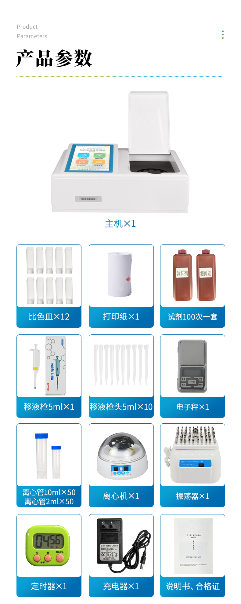 1、產(chǎn)品組成:主機(jī)、樣品前處理器件及測(cè)鮮劑;