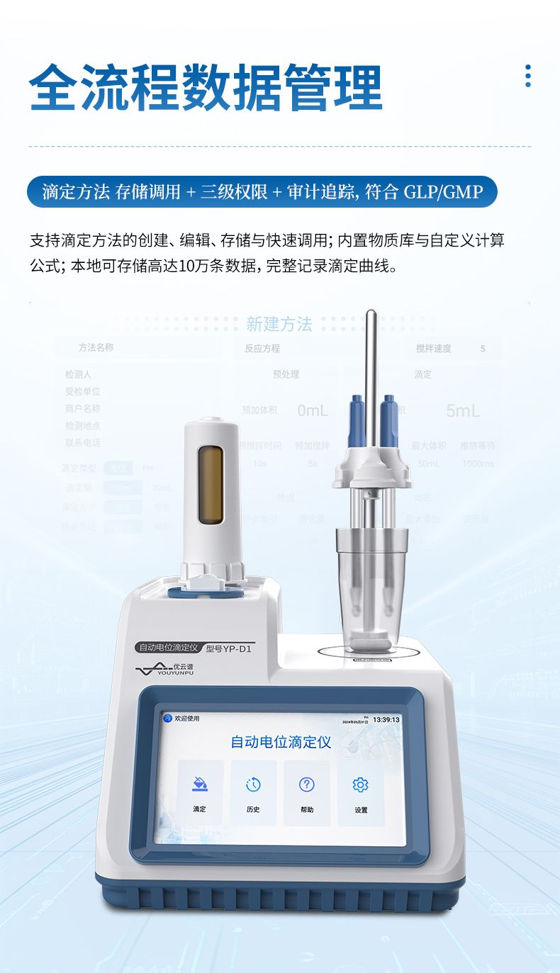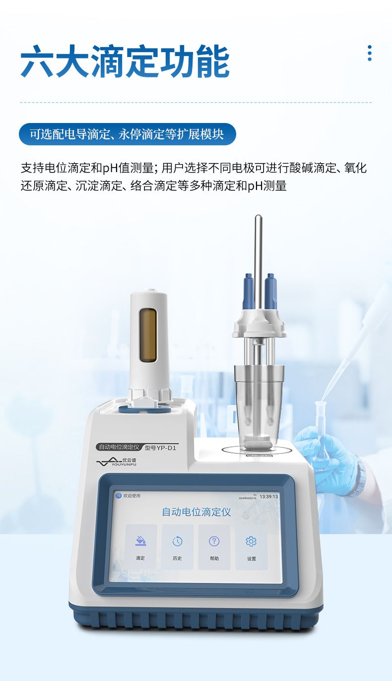 自動(dòng)電位滴定儀是一種用于化學(xué)分析的精密儀器,他通過自動(dòng)添加滴定劑來確定樣品中特定成分的濃度。該儀器基于電位滴定原理工作,即根據(jù)在滴定過程中電池電動(dòng)勢的變化來確定滴定終點(diǎn)的一款滴定設(shè)備。設(shè)備滿足國家檢定規(guī)程JJG 814-2015《自動(dòng)電位滴定儀》儀器級(jí)別中的0.05級(jí)別,即儀器最大示值誤差為±1.5%,儀器示值重復(fù)性≤0.2%
