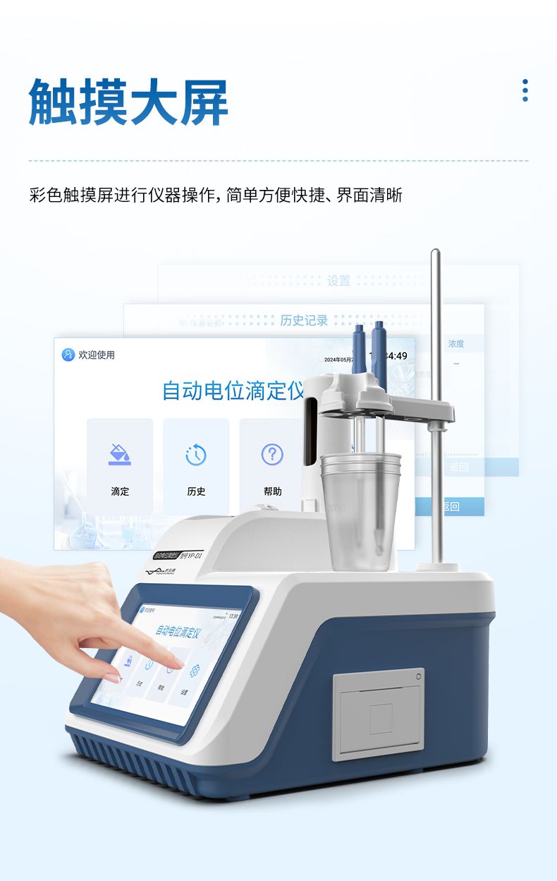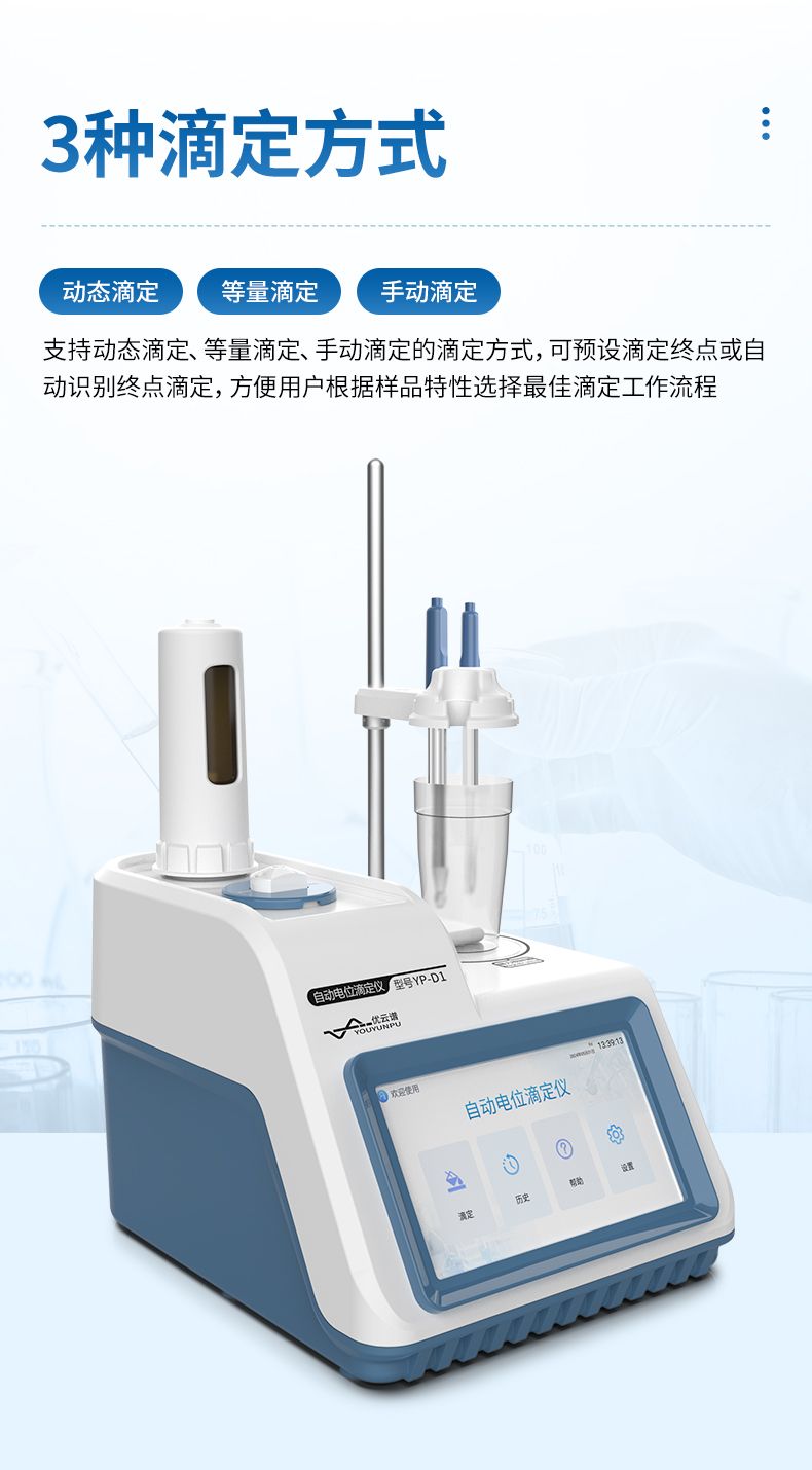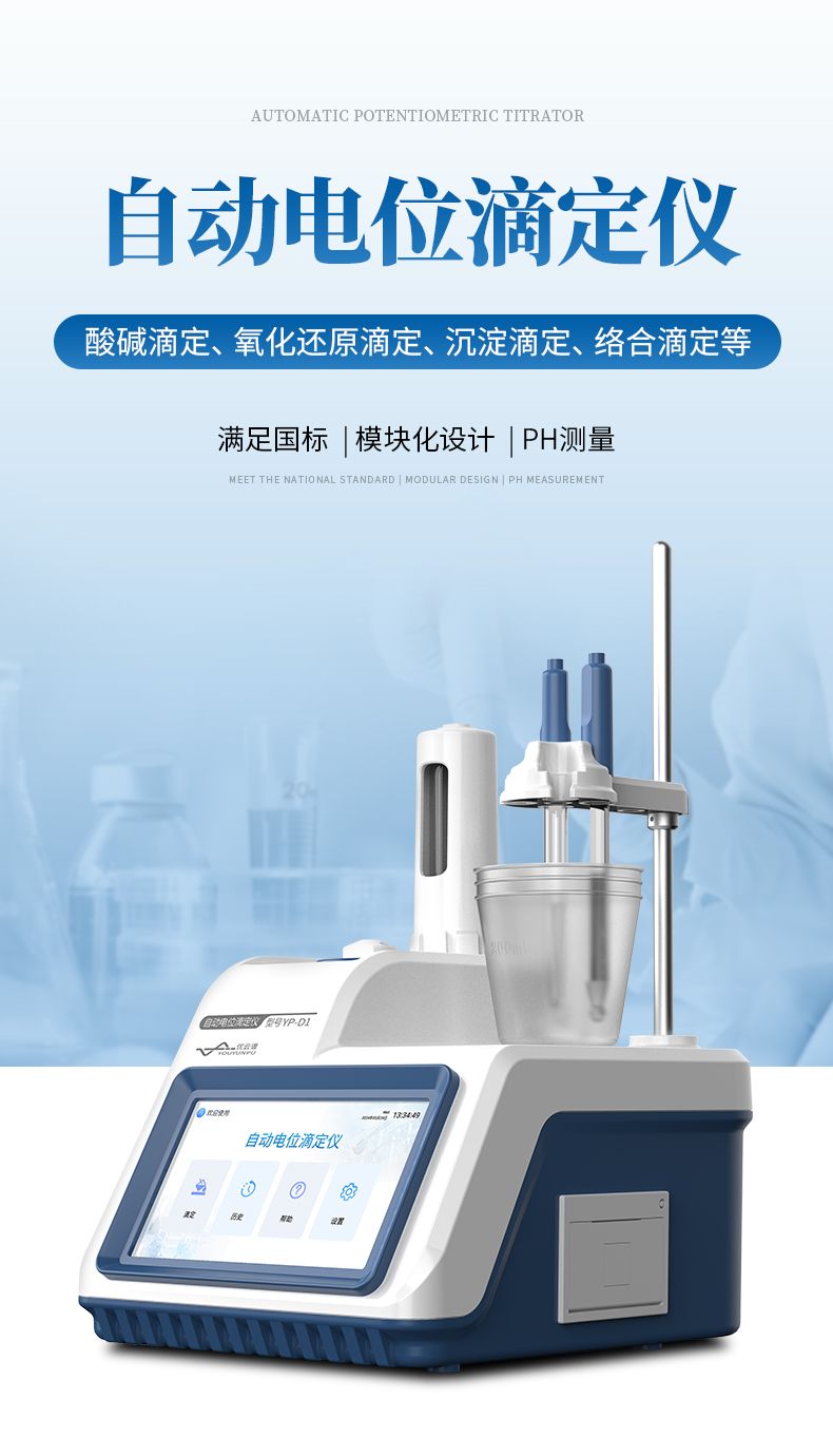自動電位滴定儀是一種用于化學(xué)分析的精密儀器,他通過自動添加滴定劑來確定樣品中特定成分的濃度。該儀器基于電位滴定原理工作,即根據(jù)在滴定過程中電池電動勢的變化來確定滴定終點(diǎn)的一款滴定設(shè)備。設(shè)備滿足國家檢定規(guī)程JJG 814-2015《自動電位滴定儀》儀器級別中的0.05級別,即儀器最大示值誤差為±1.5%,儀器示值重復(fù)性≤0.2%
