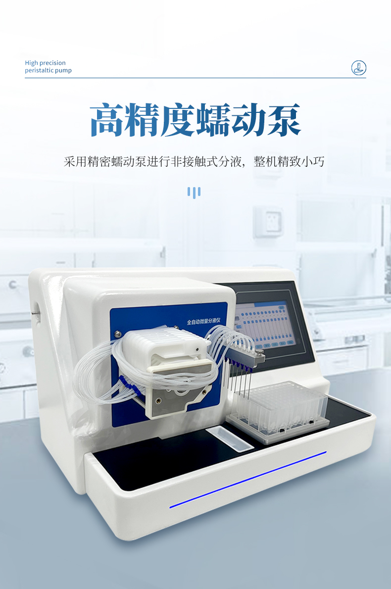 1、全自動(dòng)微量分液儀采用精密蠕動(dòng)泵進(jìn)行非接觸式分液,整機(jī)精致小巧;