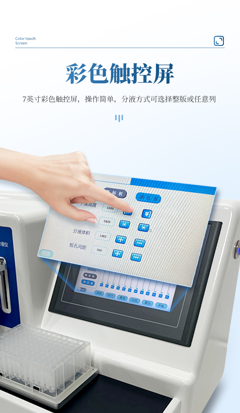 4、采用7英寸彩色液晶觸摸屏,操作簡(jiǎn)單,分液方式可選擇整版或任意列。