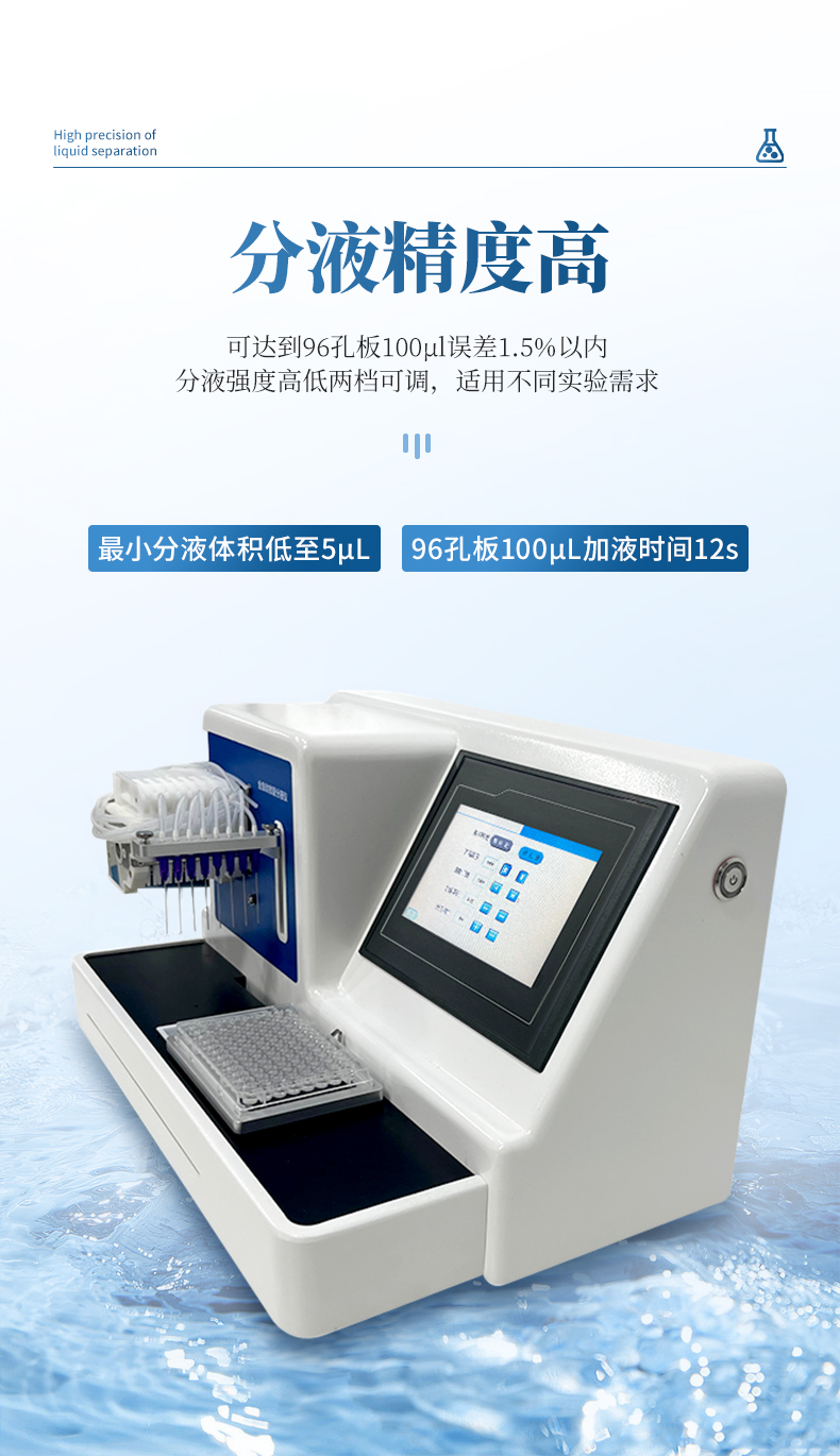 2、分液精度高,可達(dá)到96孔板100μl誤差1.5%以內(nèi),最小分液體積低至5μL,96孔板100μL加液時(shí)間12s。