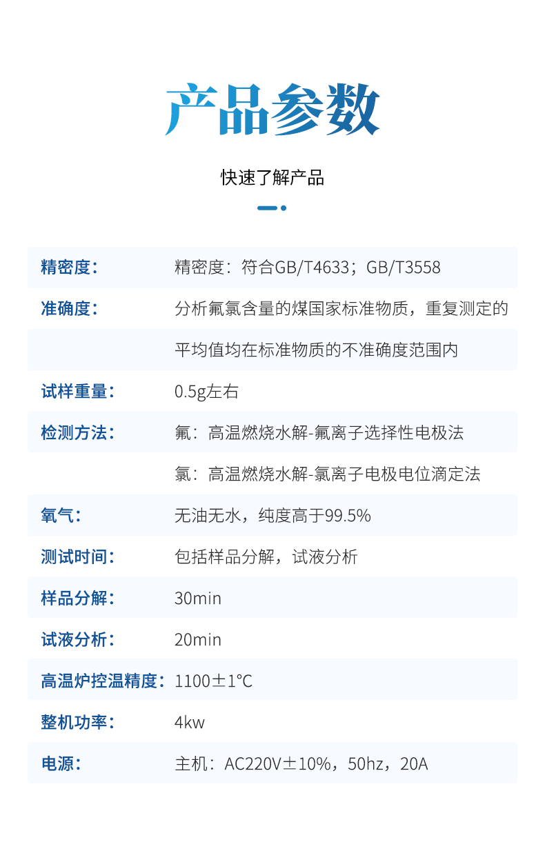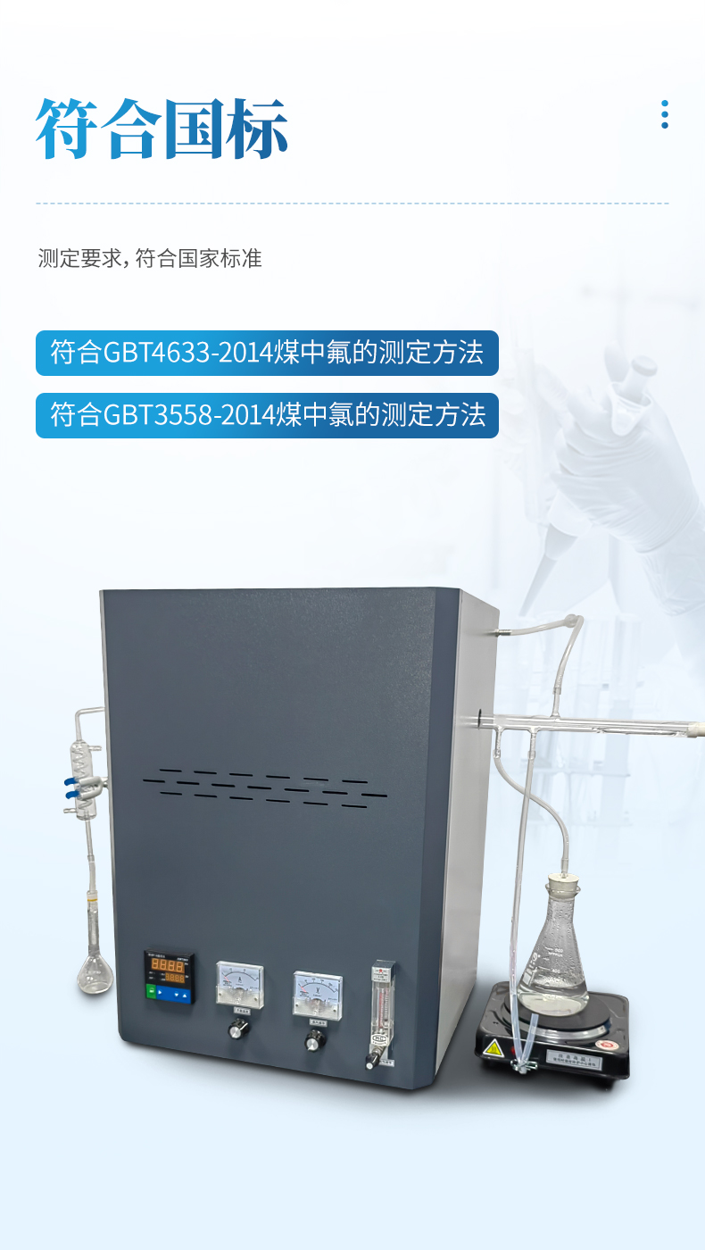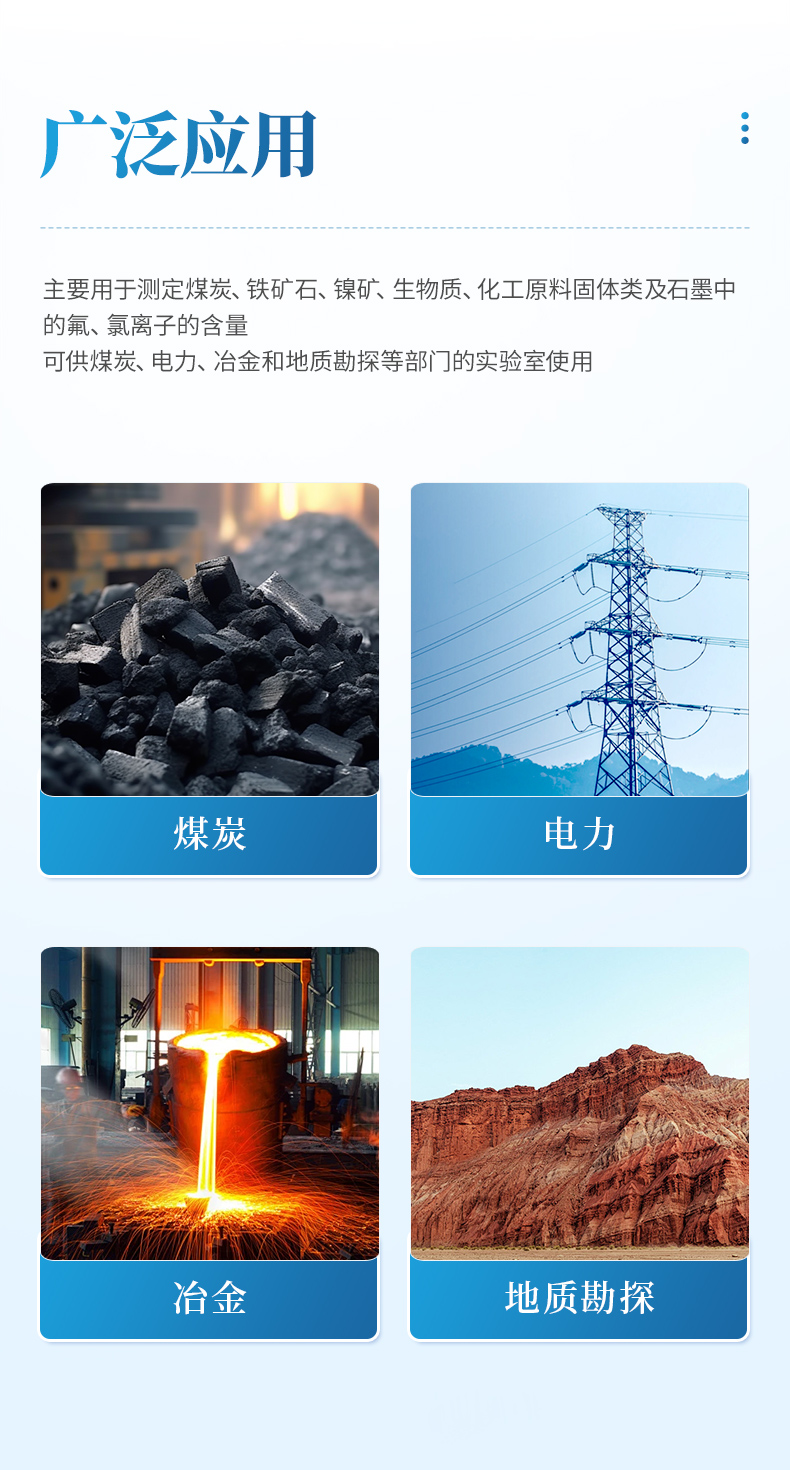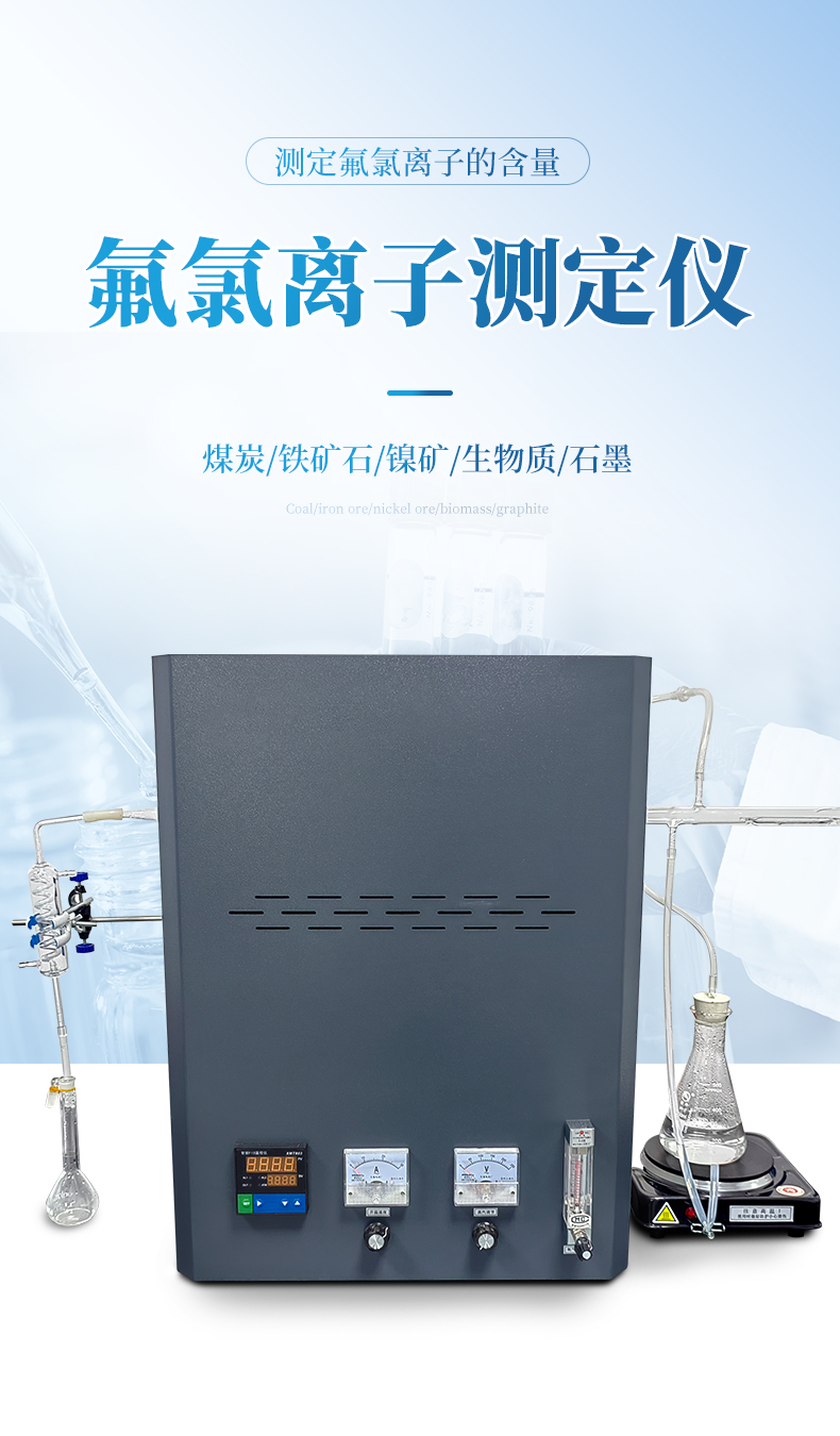 氟氯離子測(cè)定儀(高溫燃燒水解裝置、氟氯離子計(jì)、氟氯電極)主要用于測(cè)定煤炭、鐵礦石、鎳礦、生物質(zhì)、化工原料固體類(lèi)及石墨中的氟、氯離子的含量,符合GBT4633-2014煤中氟的測(cè)定方法、GBT3558-2014煤中氯的測(cè)定方法國(guó)家標(biāo)準(zhǔn)要求。檢測(cè)原理:利用高溫燃燒水解—氟/氯離子選擇性電極法測(cè)定煤中總氟、氯含量??晒┟禾俊㈦娏?、冶金和地質(zhì)勘探等部門(mén)的實(shí)驗(yàn)室使用。