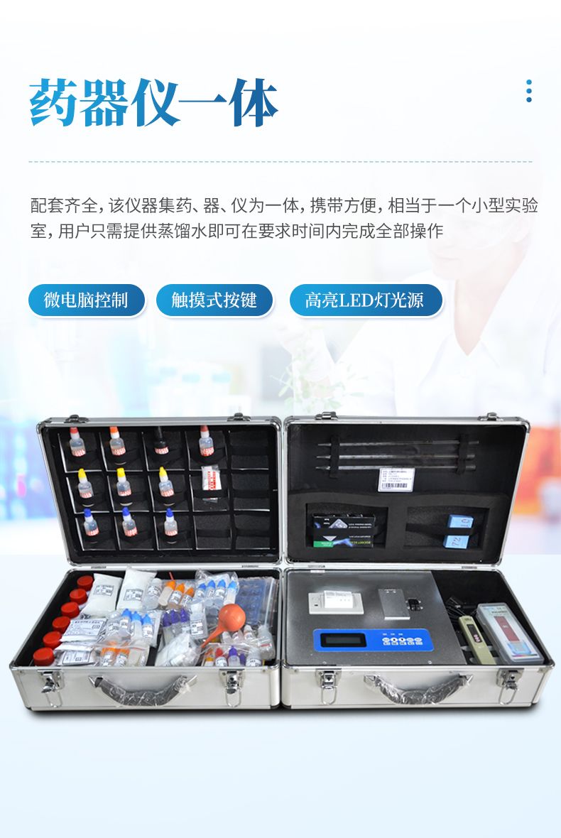 配套齊全,該儀器集藥、器、儀為一體,攜帶方便,相當于一個小型實驗室,用戶只需提供蒸餾水即可在要求時間內(nèi)完成全部操作。