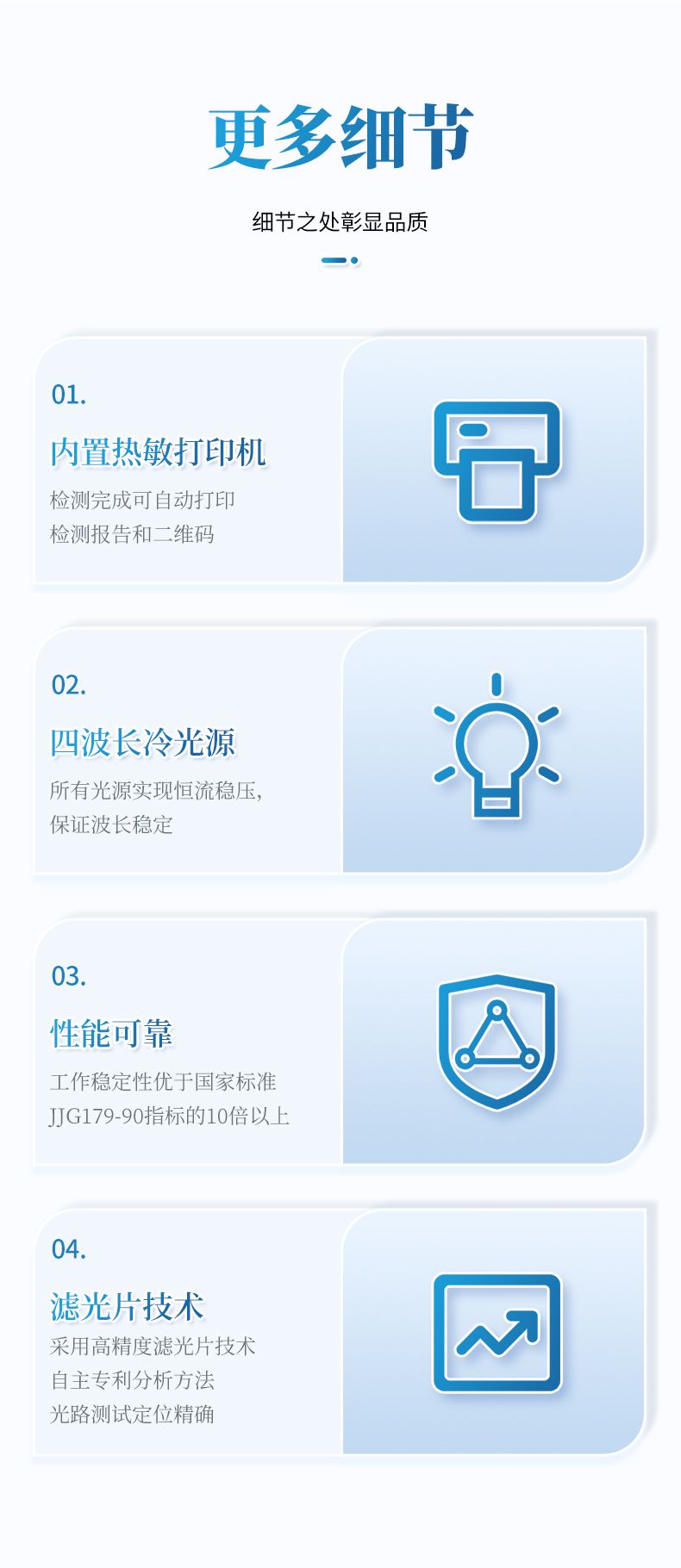 ★獨家采用高亮LED燈光源、雙撥輪濾光式處理技術(shù),保證光源波長穩(wěn)定, 硅半導(dǎo)體作為信號接收系統(tǒng), 壽命長達10萬小時級別。光源穩(wěn)定,重現(xiàn)性好,準確度高。