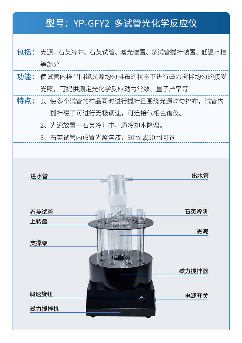 | YP-GFY2 多試管反應(yīng)器 | 包括:光源、石英冷井、石英試管、濾光裝置、多試管攪拌裝置、低溫水槽等部分。 功能:使試管內(nèi)樣品圍繞光源均勻排布的狀態(tài)下進(jìn)行磁力攪拌均勻的接受光照,可提供測(cè)定光化學(xué)反應(yīng)動(dòng)力常數(shù)、量子產(chǎn)率等 特點(diǎn):1、使多個(gè)試管的樣品同時(shí)進(jìn)行攪拌且圍繞光源均勻排布,試管內(nèi)攪拌磁子可進(jìn)行無極調(diào)速,可連接氣相色譜儀。 2、光源放置于石英冷井中,通冷卻水降溫。 3、石英試管內(nèi)放置光照溶液,30ml或50ml可選 |