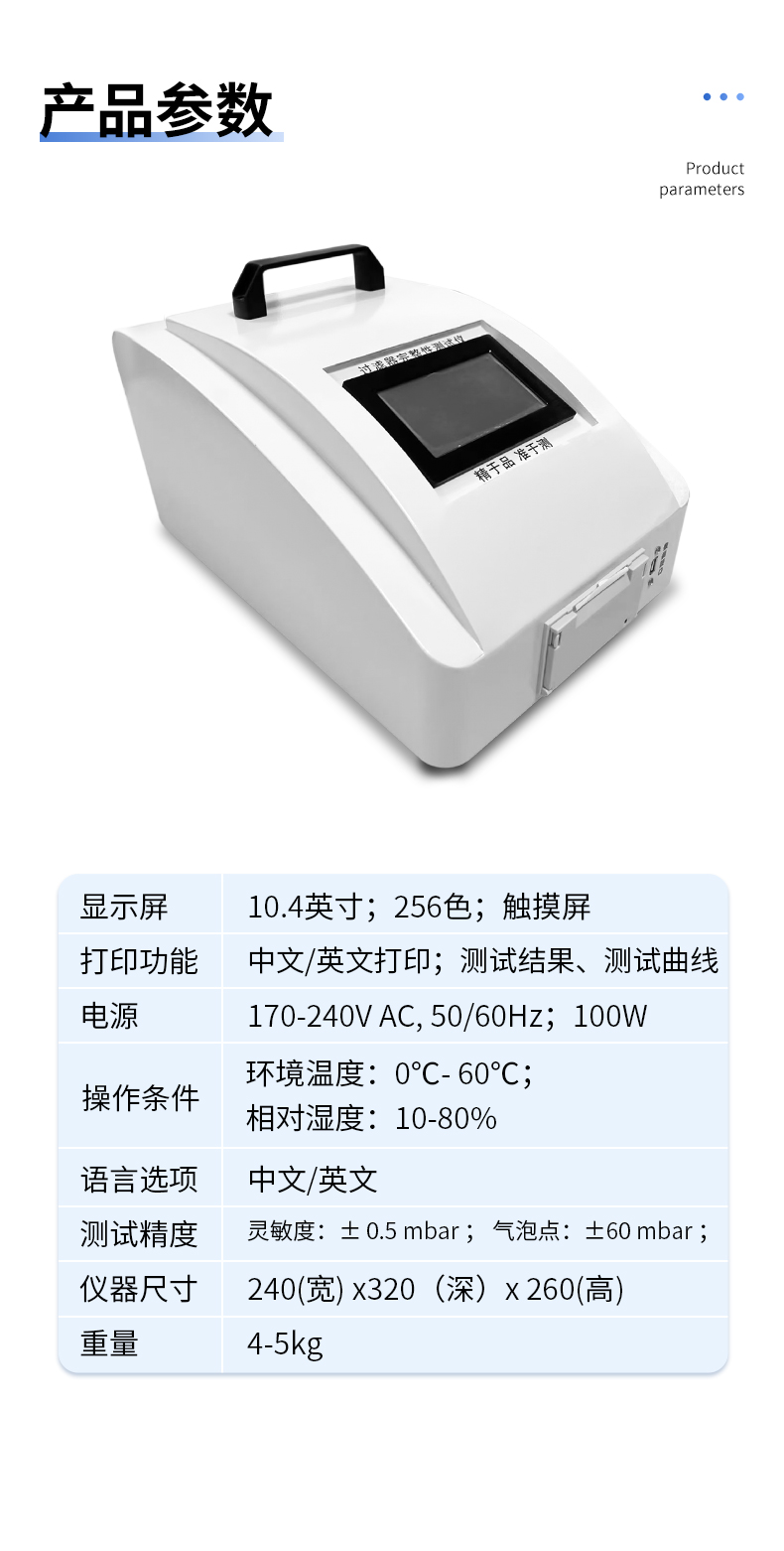 測試耗時 | 基本泡點(diǎn)測試:2 min±2min;擴(kuò)散流測試7±2min; 水浸入流量測試7±2min;系統(tǒng)氣密性:3±1min; |