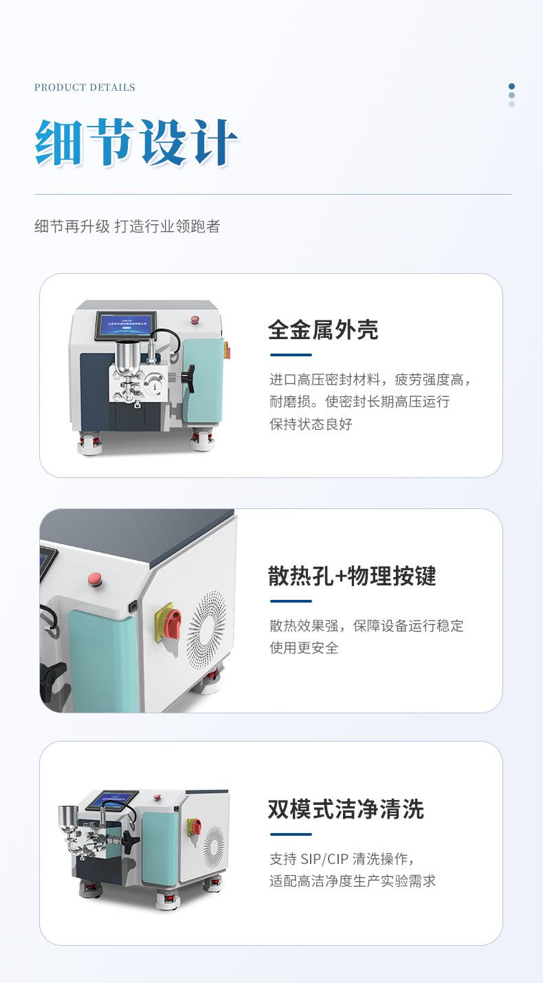 6、物料控溫:要求均質閥帶控溫夾套與控溫介質出入接頭、連接管路,可實現(xiàn)在線控溫。低溫時,出料溫度可控制在4℃左右,保證物料生物學活性。