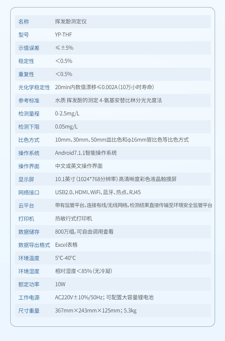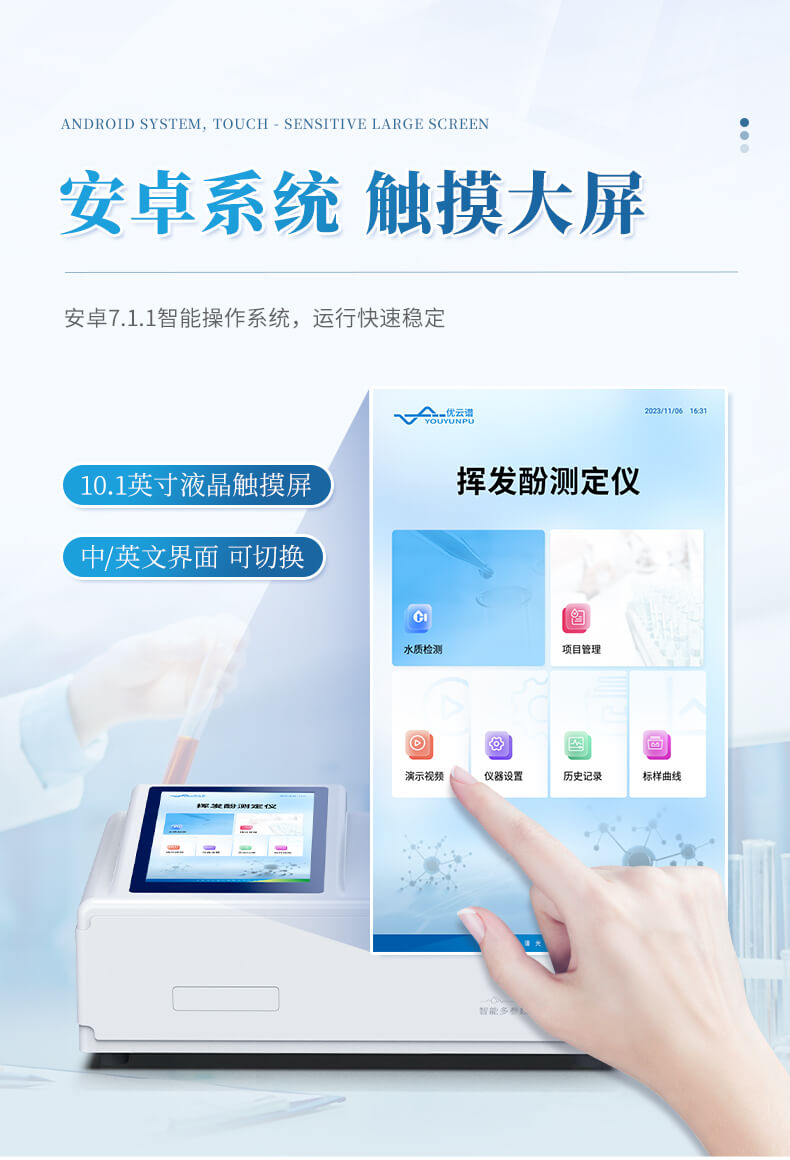 本儀器主要檢測(cè)水質(zhì)揮發(fā)性酚含量指標(biāo),兼具智能數(shù)據(jù)分析功能,圖表、列表顯示數(shù)據(jù),分析一目了然;高清晰度彩色液晶觸摸顯示屏,Android智能操作系統(tǒng),中文顯示界面,中英文鍵盤,人性化操作,使用更簡(jiǎn)單。