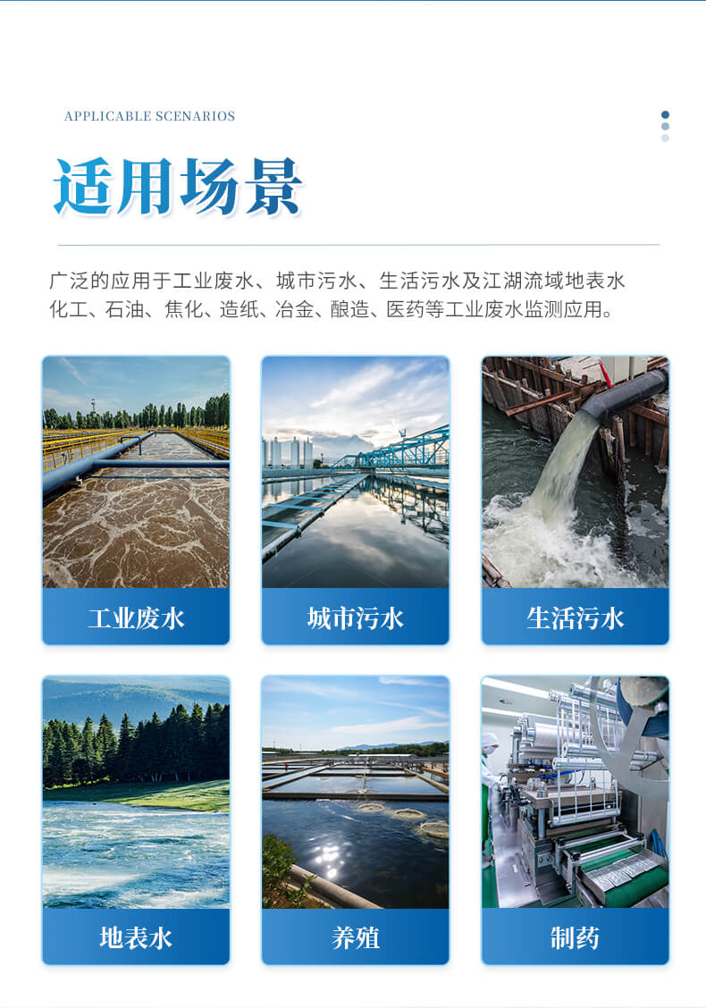 能夠廣泛的應(yīng)用于各種行業(yè)(工業(yè)廢水、城市污水、生活污水及江湖流域地表水)廢水的檢測(cè),可適合不同用戶的多種需求,可在化工、石油、焦化、造紙、冶金、釀造、醫(yī)藥等工業(yè)廢水及各種生活污水監(jiān)測(cè)應(yīng)用。