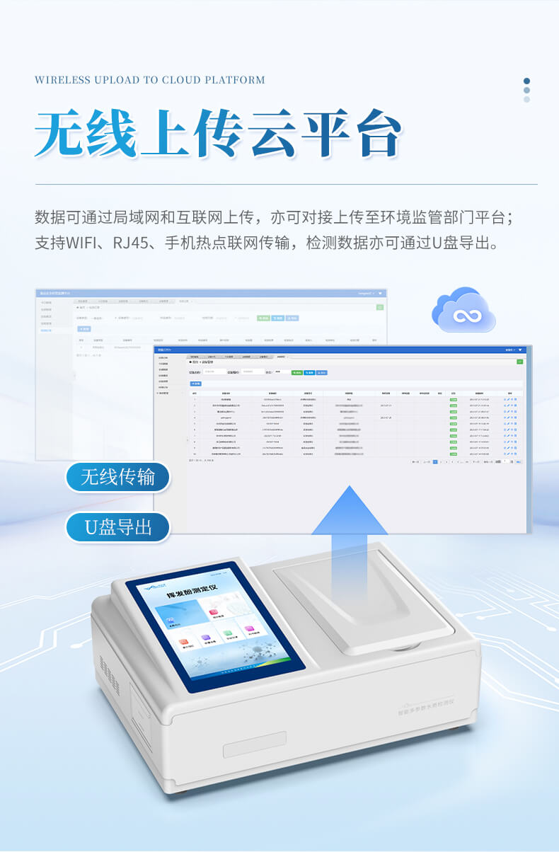 云平臺(tái):儀器帶有監(jiān)管平臺(tái),連接有線/無(wú)線網(wǎng)絡(luò),檢測(cè)結(jié)果直接傳輸至環(huán)境安全監(jiān)管平臺(tái);