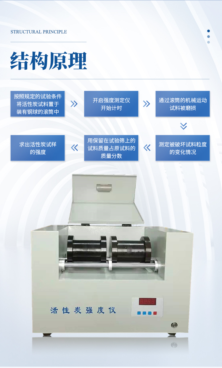 活性炭強(qiáng)度測(cè)定儀儀按照規(guī)定的試驗(yàn)條件,將活性炭試料置于裝有鋼球的滾筒中,開(kāi)啟強(qiáng)度測(cè)定儀,開(kāi)始計(jì)時(shí),通過(guò)滾筒的機(jī)械運(yùn)動(dòng),試料被磨損,測(cè)定被**試料粒度的變化情況,用保留在試驗(yàn)篩上的試料質(zhì)量占原試料的質(zhì)量分?jǐn)?shù),可求出活性炭試樣的強(qiáng)度。