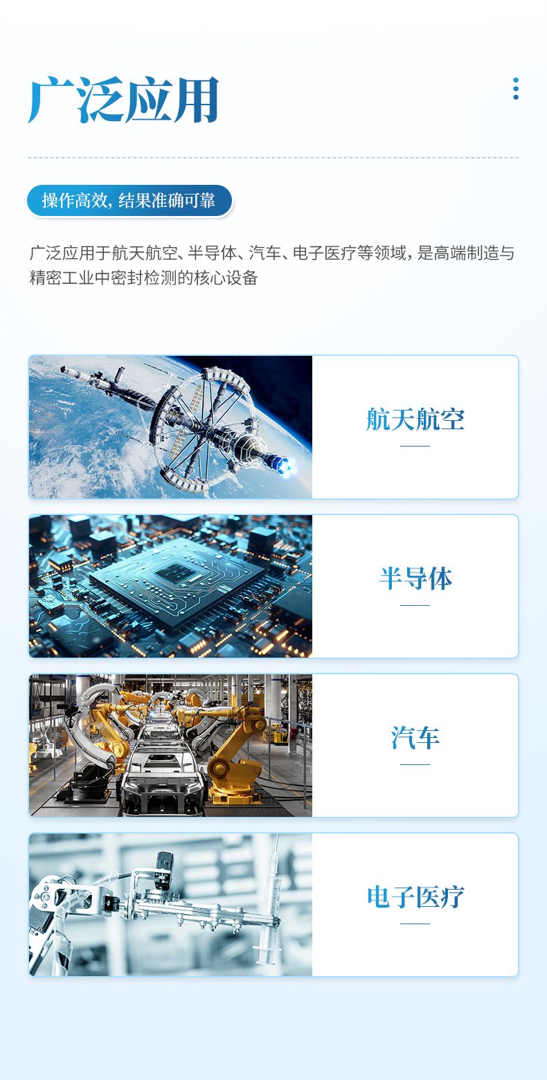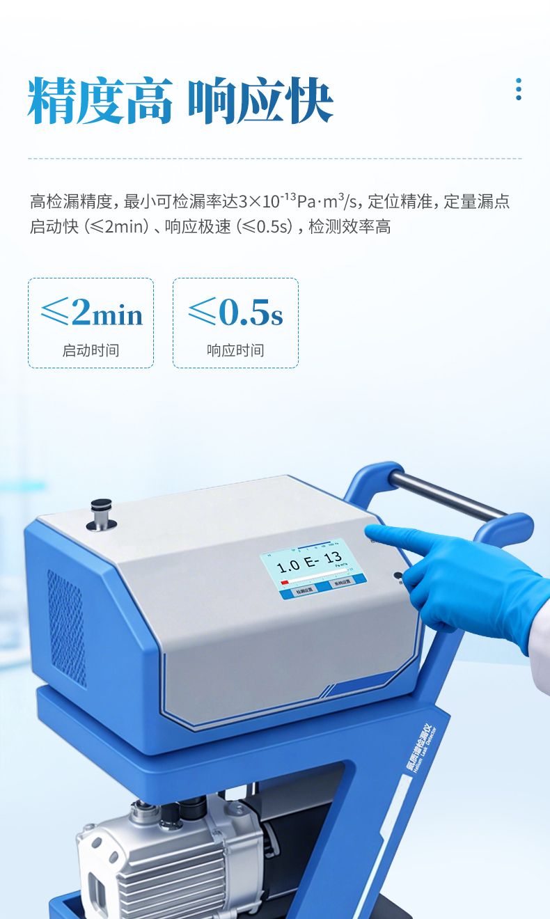 氦質(zhì)譜檢漏儀是采用質(zhì)譜學(xué)原理、以氦氣為示漏氣體的高精度無損檢漏設(shè)備,憑借氦氣大氣含量低、質(zhì)荷比特征鮮明的優(yōu)勢,實(shí)現(xiàn)超高靈敏度檢漏,可精準(zhǔn)定位并定量漏點(diǎn)。設(shè)備支持真空噴氦、吸槍掃描、背壓累積等多種檢漏模式,適配真空 / 帶壓容器、密封組件、精密器件等不同檢測需求,廣泛應(yīng)用于航天航空、半導(dǎo)體、汽車、電子醫(yī)療等領(lǐng)域,是高端制造與精密工業(yè)中密封檢測的核心設(shè)備。