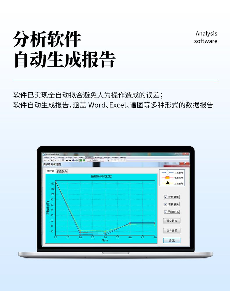 分析軟件功能強大 ,具備一鍵式全自動擬合能力 ,具備國際最領(lǐng)先的擬合方法 ,滿足各 種液滴形態(tài)的精確擬合;