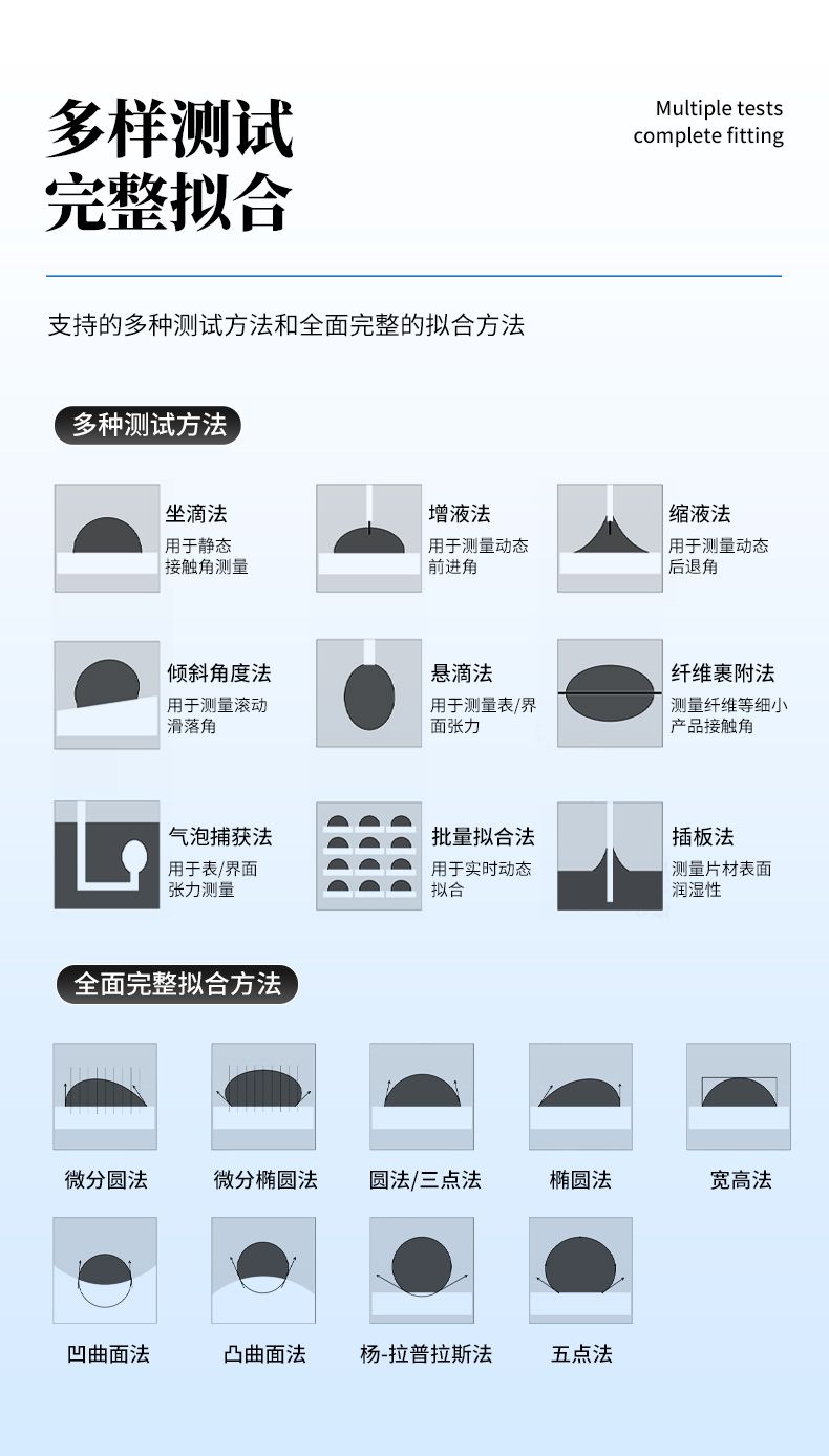| 分析軟件功能 | 1、 國內(nèi)最先進的接觸角測量分析軟件自動擬合法(一鍵自動擬合 , 不存在人工誤差)包括 :圓法擬合( Circle method)、橢圓/斜 橢圓擬合法( Ellipse/Oblique ellipse)、LY、微分橢圓法/微 分圓法( Differential circle / Differential ellipse);2、動態(tài)接觸角擬合(批量擬合多張圖像)包括 :潤濕性能測試 (Wettability)、視頻連續(xù)擬合計算(Video analysis);3、 表面能量計算( Surface energy);4、 前進后退角測量( Forward and backward angle) |