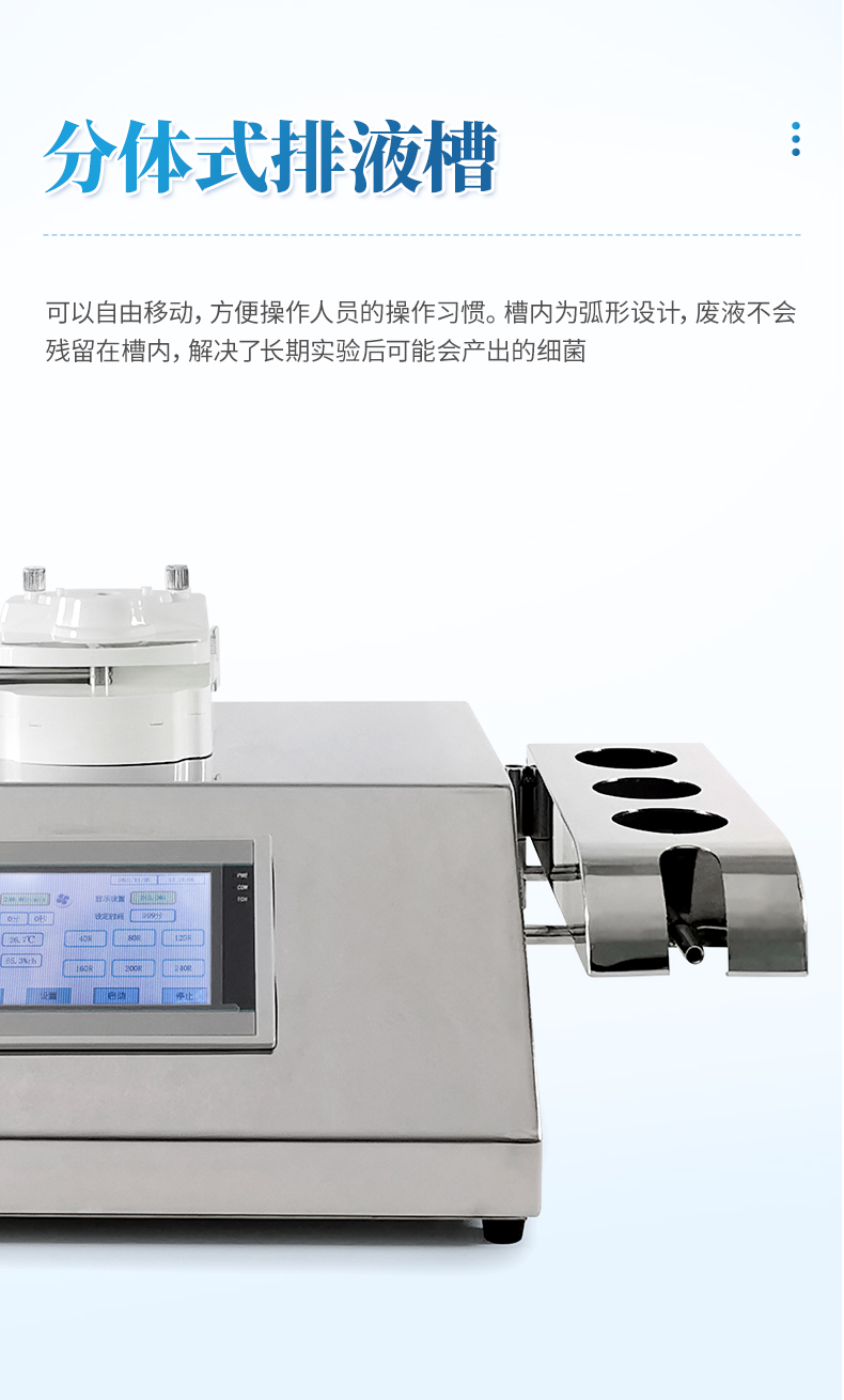 3、分體式的排液槽設(shè)計:可以自由移動,方便操作人員的操作習(xí)慣。槽內(nèi)為弧形設(shè)計,廢液不會殘留在槽內(nèi),解決了長期實驗后可能會產(chǎn)出的細(xì)菌。