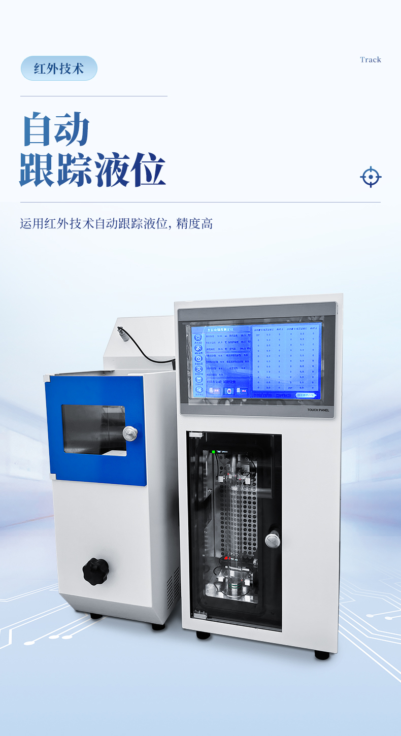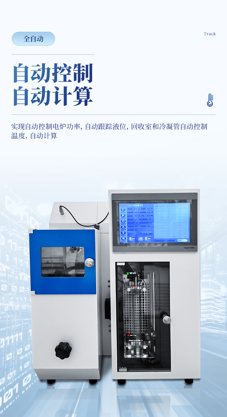 8.儀器實(shí)現(xiàn)自動控制電爐功率,自動跟蹤液位,回收室和冷凝管自動控制溫度,自動計算。