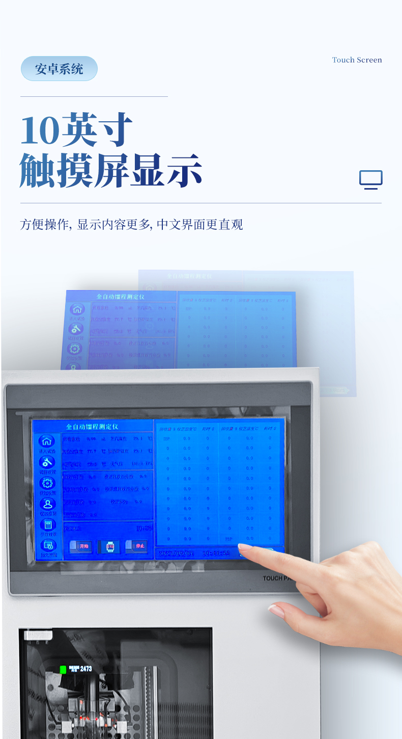2.操作采用電容式觸摸屏,其優(yōu)點(diǎn)在于無機(jī)械損耗、防塵防水、抗射頻干擾、使用壽命長。
