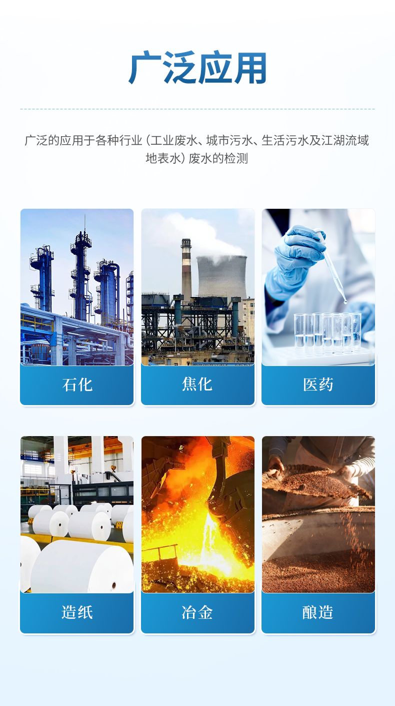 能夠廣泛的應用于各種行業(yè)(工業(yè)廢水、城市污水、生活污水及江湖流域地表水)廢水的檢測,可適合不同用戶的多種需求,可在化工、石油、焦化、造紙、冶金、釀造、醫(yī)藥等工業(yè)廢水及各種生活污水監(jiān)測應用。