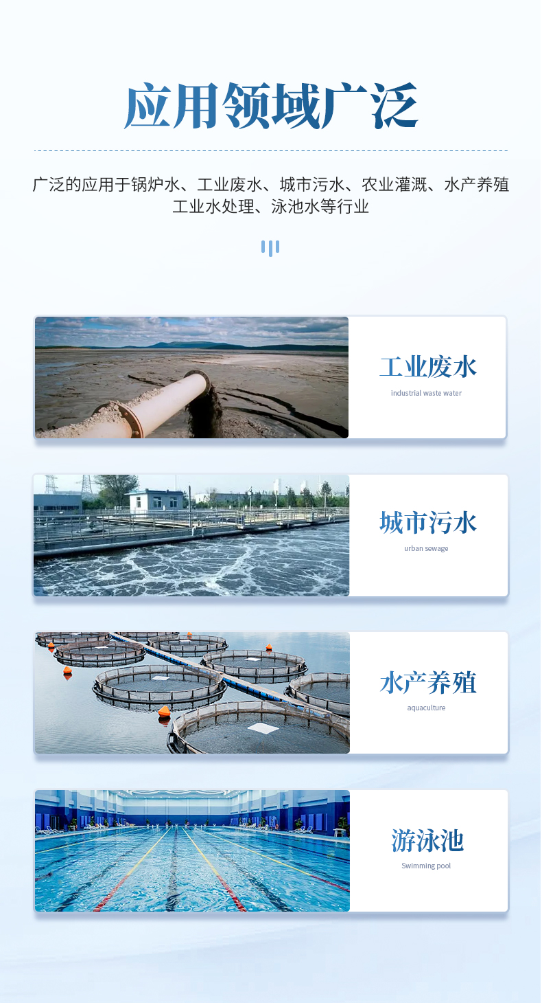 適用于純凈水廠、自來水廠、生活污水處理廠、工業(yè)污水、水產(chǎn)養(yǎng)殖、河流監(jiān)測、游泳場館、水源保護(hù)、生產(chǎn)監(jiān)測、科研實(shí)驗(yàn)等。