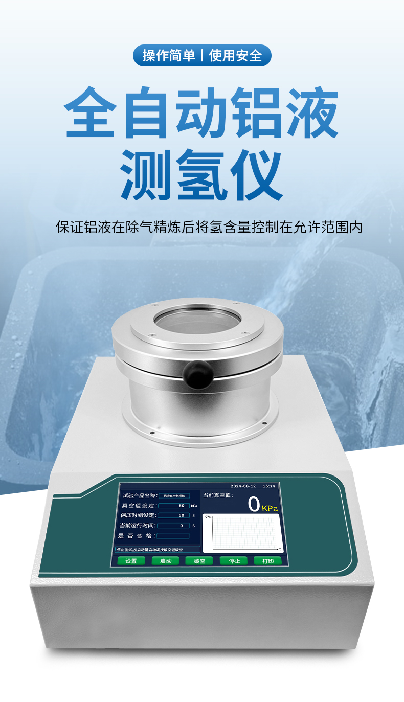 由于鋁液是在真空中凝固,其整個凝固過程不受外界空氣的影響,測得試樣的含氫量就是坩堝取樣時的含氫量。設備具有檢測準確、運行可靠、易于操作、維護簡便等優(yōu)點,是鋁制件廠檢測含氫量的理想設備。