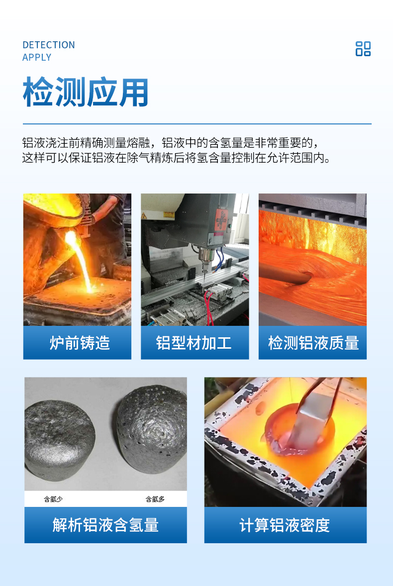 鋁液中唯一大量存在的氣體氫和各種夾渣的存在,使得鋁鑄件極易產(chǎn)生針孔、 顯微疏松等缺陷,導致力學性能、內部質量大為降低。因此在澆注前精確測量熔融鋁液中的含氫量是非常重要的,這樣可以保證鋁液在除氣精煉后將氫含量控制在允許范圍內。