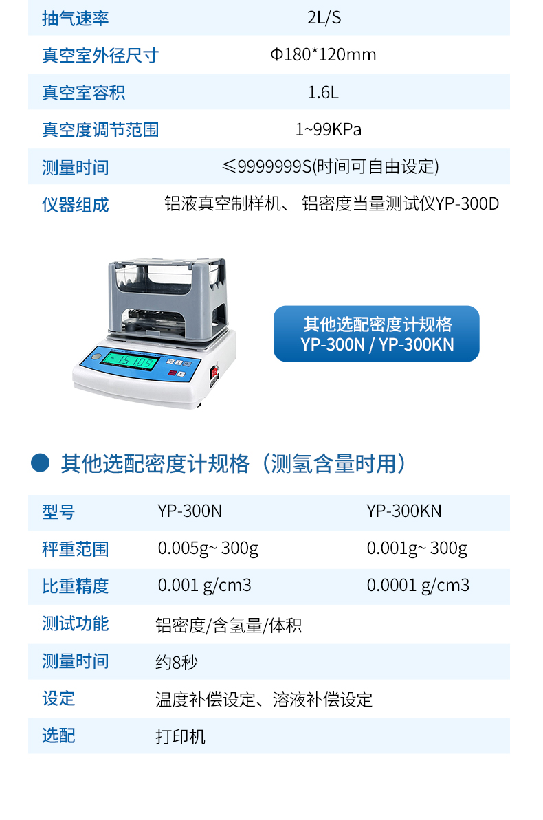 依據(jù)減壓凝固法的原理測量鑄造鋁液中氫含量檢驗儀器。利用真空抽氣技術使液態(tài)試樣中的氫快速析出,待試樣凝固后,可以通過試樣同標準試樣表面質量的對比來判定鋁液的氫含量是否達到要求,也可通過計算得出試塊的實際比重,與標準比重比較來判斷該鋁液是否達到要求。