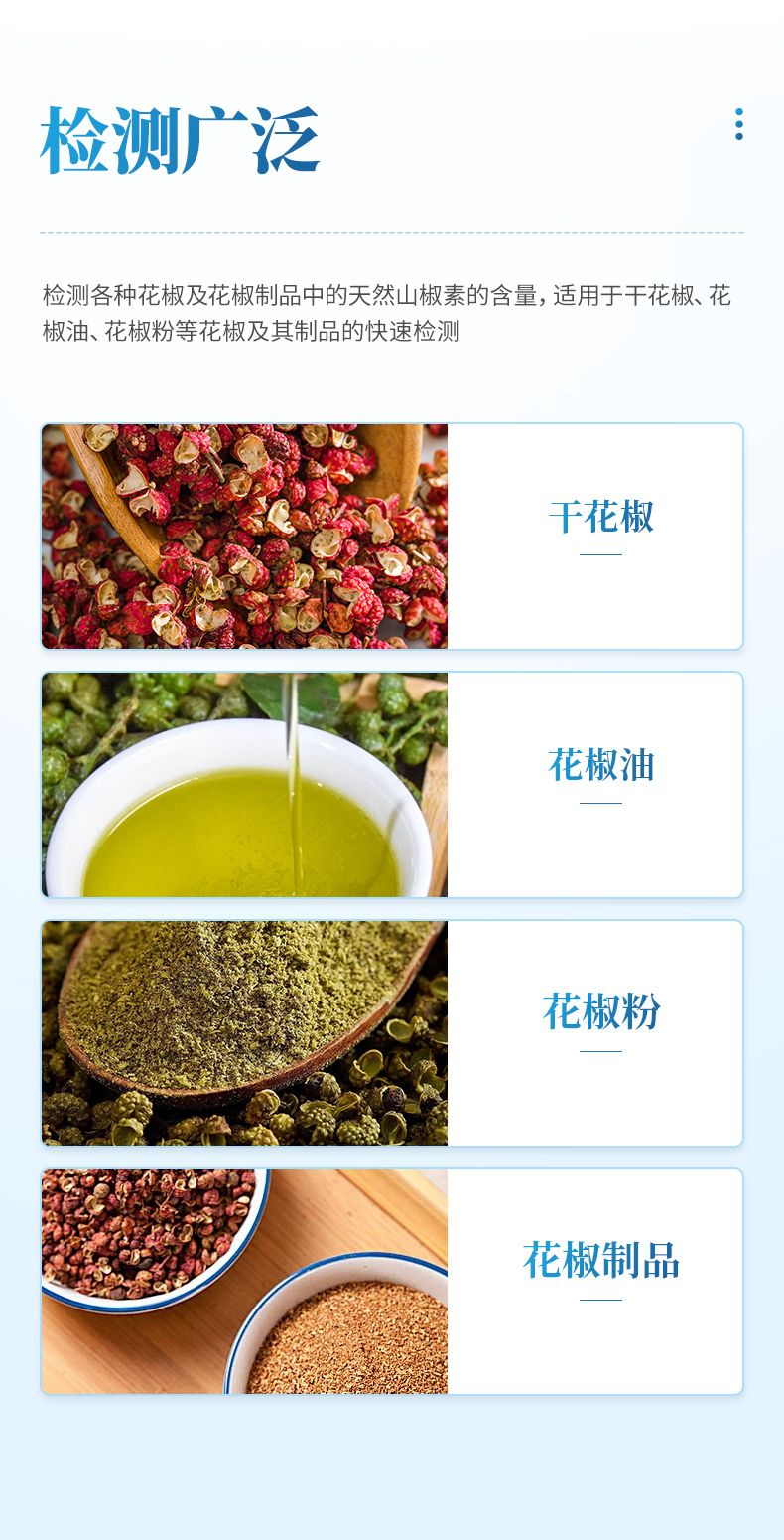 1. 樣品檢測(cè)范圍:花椒5-30mg/g 花椒油 0.6-3mg/g;