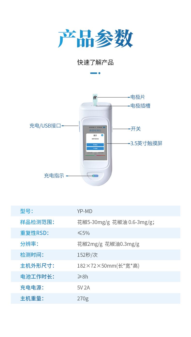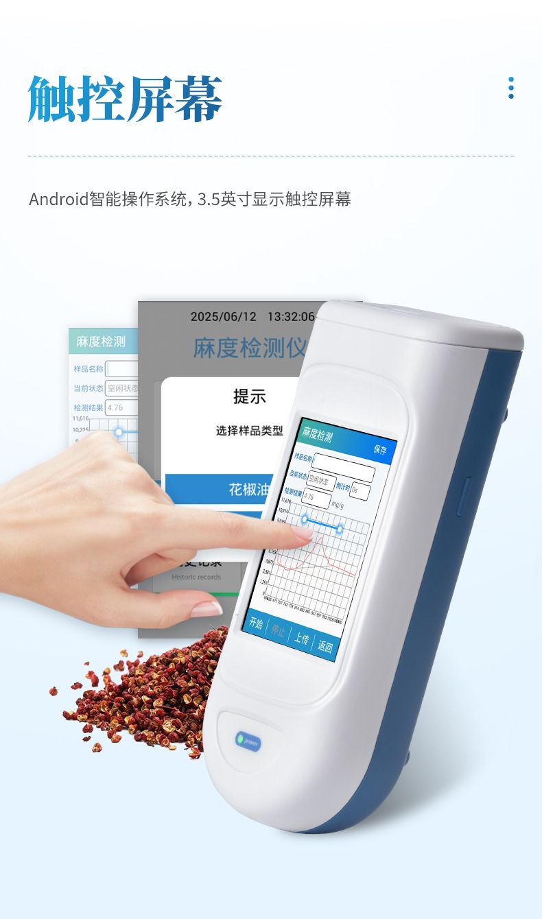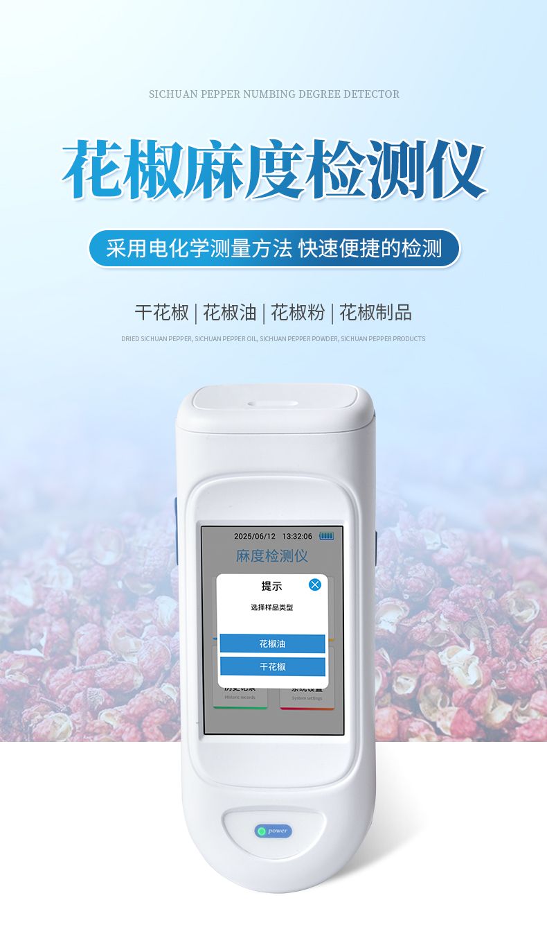 手持式麻度檢測(cè)儀采用電化學(xué)測(cè)量方法,可快速、便捷地檢測(cè)各種花椒及花椒制品中的天然山椒素的含量,適用于干花椒、花椒油、花椒粉等花椒及其制品的快速檢測(cè)。