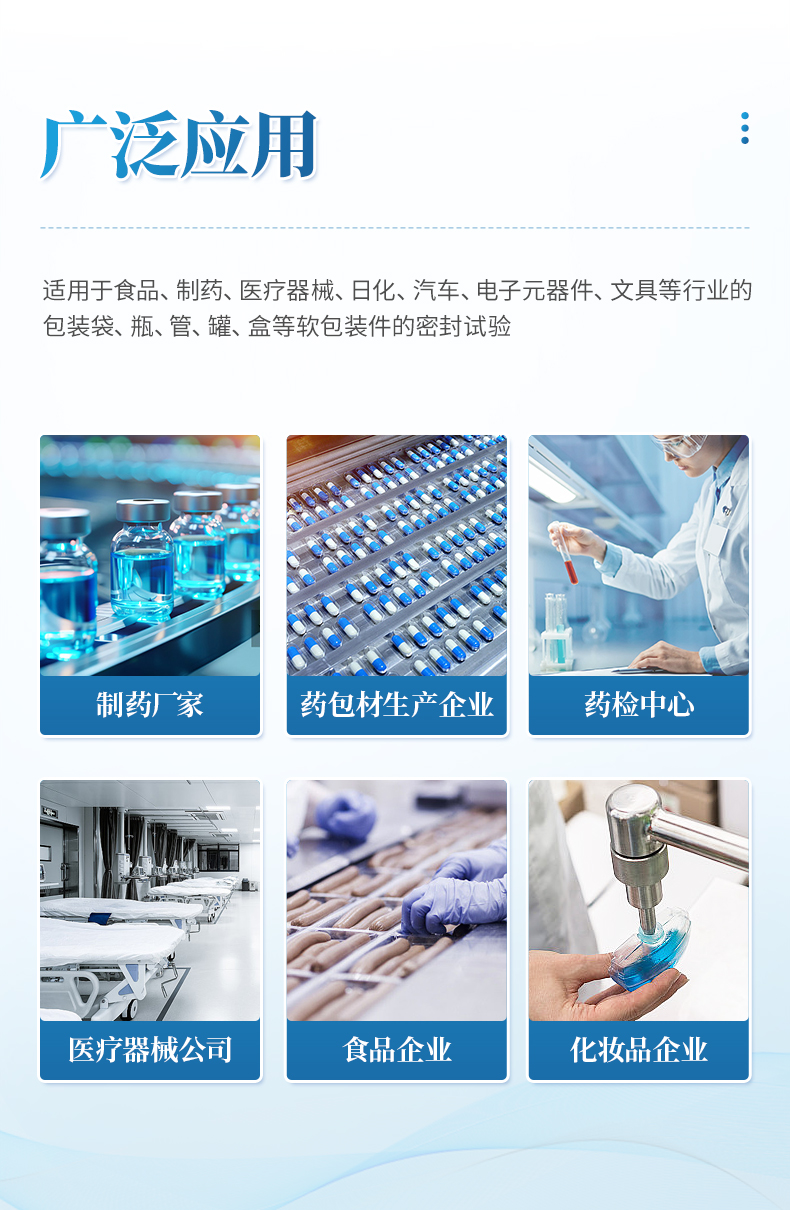 本產(chǎn)品適用于食品、制藥、醫(yī)療器械、日化、汽車、電子元器件、文具等行業(yè)的包裝袋、瓶、管、罐、盒等軟包裝件的密封試驗(yàn)。通過(guò)試驗(yàn)可以有效地比較和評(píng)價(jià)軟包裝件的密封工藝及密封性能,為確定相關(guān)的技術(shù)指標(biāo)提供科學(xué)依據(jù),也可進(jìn)行經(jīng)跌落、耐壓試驗(yàn)后的試件的密封性能測(cè)試。