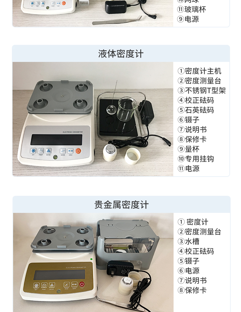 密度計主機②密度測量臺③水槽④校正砝碼⑤抗浮架⑥鑷子⑦說明書⑧保修卡⑨網(wǎng)球⑩玻璃杯?電源