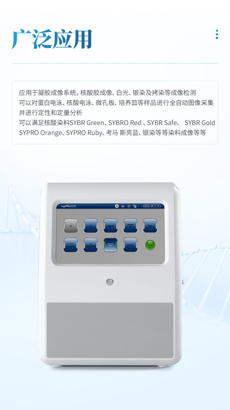 應用于凝膠成像系統(tǒng),核酸膠成像、白光、銀染及拷染等成像檢測??梢詫Φ鞍纂娪尽⒑怂犭娪?、微孔板、培養(yǎng)皿等樣品進行全自動圖像采集并進行定性和定量分析??梢詽M足核酸染 料 SYBR Green、SYBRO Red 、SYBR Safe、 SYBR Gold、SYPRO Orange、SYPRO Ruby、考馬 斯亮藍、銀染等等染料成像等等