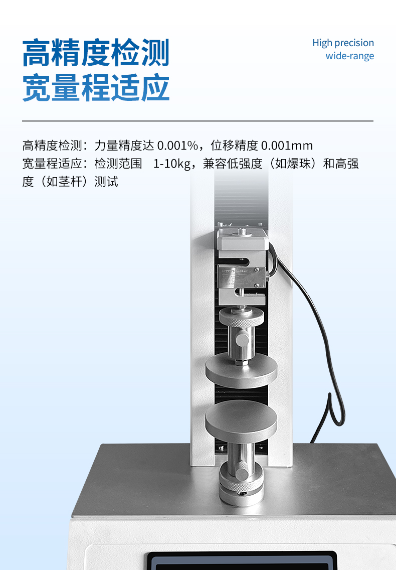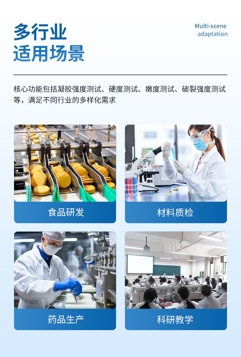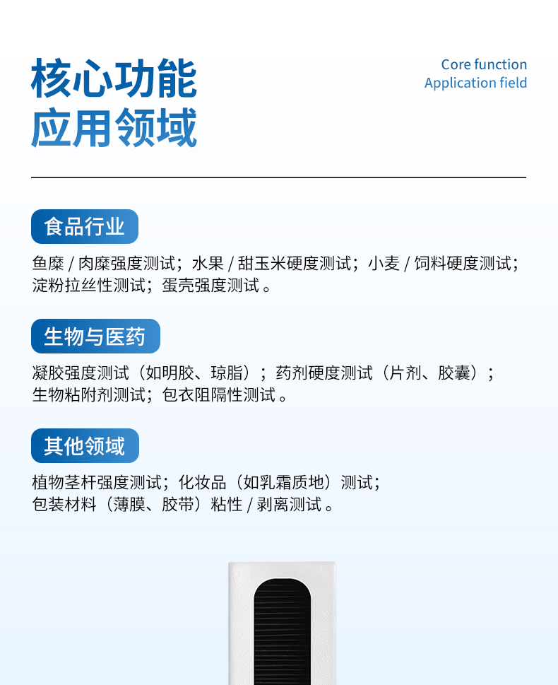 廣泛應(yīng)用于食品、生物制品、藥品、化妝品及包裝材料等諸多領(lǐng)域:可進(jìn)行魚糜強(qiáng)度測(cè)試、蛋殼強(qiáng)度測(cè)試、肉品嫩度測(cè)試、肉品系水性測(cè)試、凝膠強(qiáng)度測(cè)試、香精爆珠測(cè)試、水果硬度測(cè)試、植物莖桿強(qiáng)度測(cè)試。小麥硬度測(cè)試、飼料硬度測(cè)試、茶葉桿預(yù)嫩度測(cè)試、甜玉米硬度測(cè)試。土硬度測(cè)試。淀粉拉絲性測(cè)試、劑破裂強(qiáng)度測(cè)試,劑包衣阻隔特性測(cè)試、錦劑膜衣粘性測(cè)試、顆粒狀藥劑的易碎性測(cè)試。柱劑硬度測(cè)試、生物粘附劑測(cè)試等等(不同測(cè)試用不同夾具)