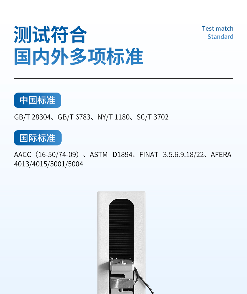 該儀器符合多項(xiàng)國(guó)家和國(guó)際標(biāo)準(zhǔn):GB/T 28304-2012GB/T6783-2013、AACC(16-50)、 AACC(74-09) 、NYT 11802006SC/T 3702-2014 、 ASTM D1894-90 、FINATmethod 3.5.6.9.18 22、 AFERA40134015.5001.5004