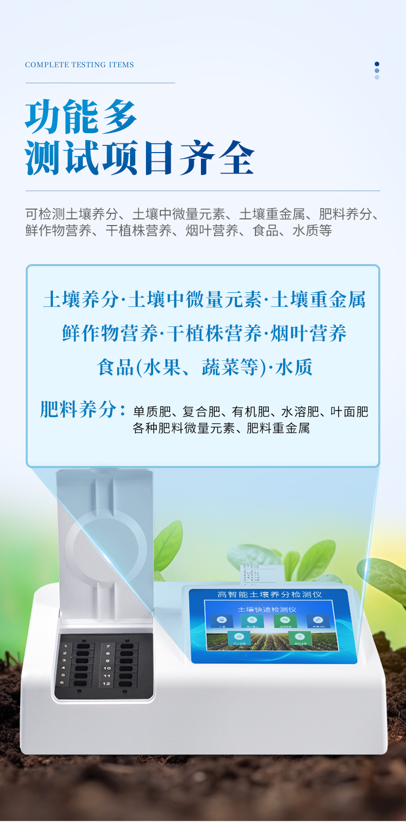 1、土壤養(yǎng)分:●土壤銨態(tài)氮、土壤有效磷、土壤速效鉀、土壤硝態(tài)氮、土壤水解氮、土壤全氮、土壤全磷、土壤全鉀、土壤有機質(丘林法)、土壤有機質(浸提法)、土壤總有機碳、土壤碳氮比、PH值、含鹽量、水分。●土壤中微量元素:土壤鈣、土壤鎂、土壤硫、土壤硅、土壤硼、土壤鐵、土壤銅、土壤錳、土壤鋅、土壤氯、土壤鉬;●土壤重金屬:土壤鉛、土壤砷、土壤鎘、土壤鉻、土壤汞、土壤鎳、土壤鋁、土壤氟、土壤鈦、土壤硒。