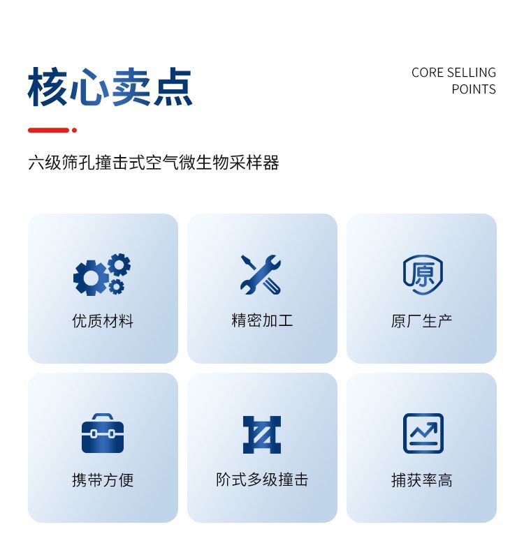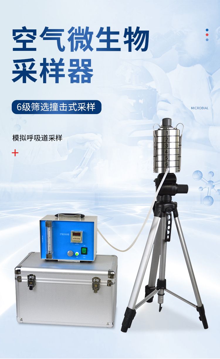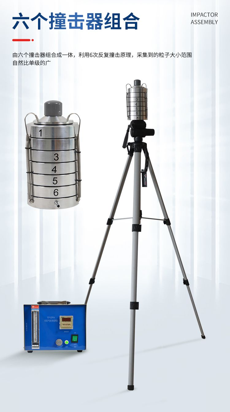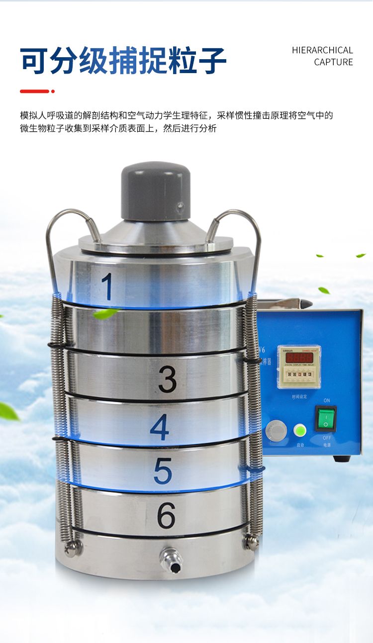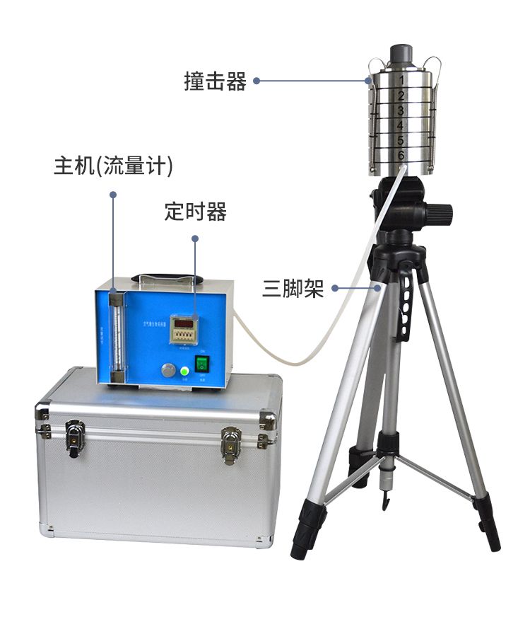整個儀器是由撞擊器、主機(流量計)、定時器、三腳架組成。撞擊器是6層有微小孔眼的鋁合金圓盤。圓盤下放瓊脂平皿,每圓盤間有密封膠圈,在通過三個彈簧掛 鉤把圓盤牢固地聯(lián)在一起。每個圓盤上有400個成環(huán)行排列、逐層減小、尺寸精確的小孔,標(biāo)準(zhǔn)采樣流量為1立方呎(28.3L/min)。當(dāng)含有微生物粒子 的氣流進(jìn)入最上層的采樣口后,由于氣流的逐層增高,不同大小的微生物粒子按空氣動力學(xué)特征分別撞擊在相應(yīng)的瓊脂表面上。捕獲在各級上的粒子大小范圍是由該 級孔眼的氣流速度和上一級的粒子截阻率而決定的。第1、2級類似人的上呼吸道捕獲的粒子,第3~6級類似人的下呼吸道捕獲的粒子,這就相當(dāng)程度上復(fù)制了這 些粒子在呼吸道的穿透作用和沉著部位。