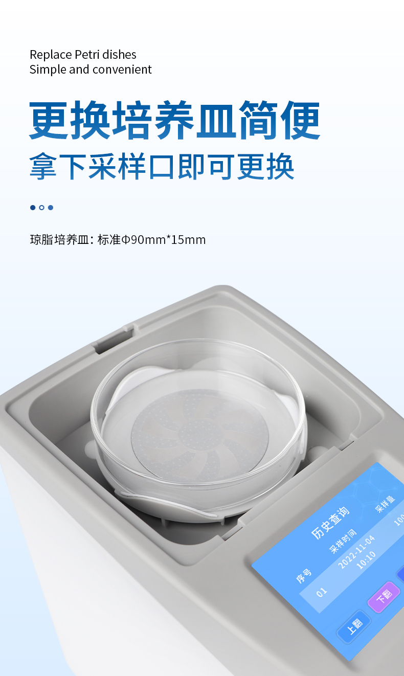 ● 更換培養(yǎng)皿簡便,拿下采樣口即可更換培養(yǎng)皿。