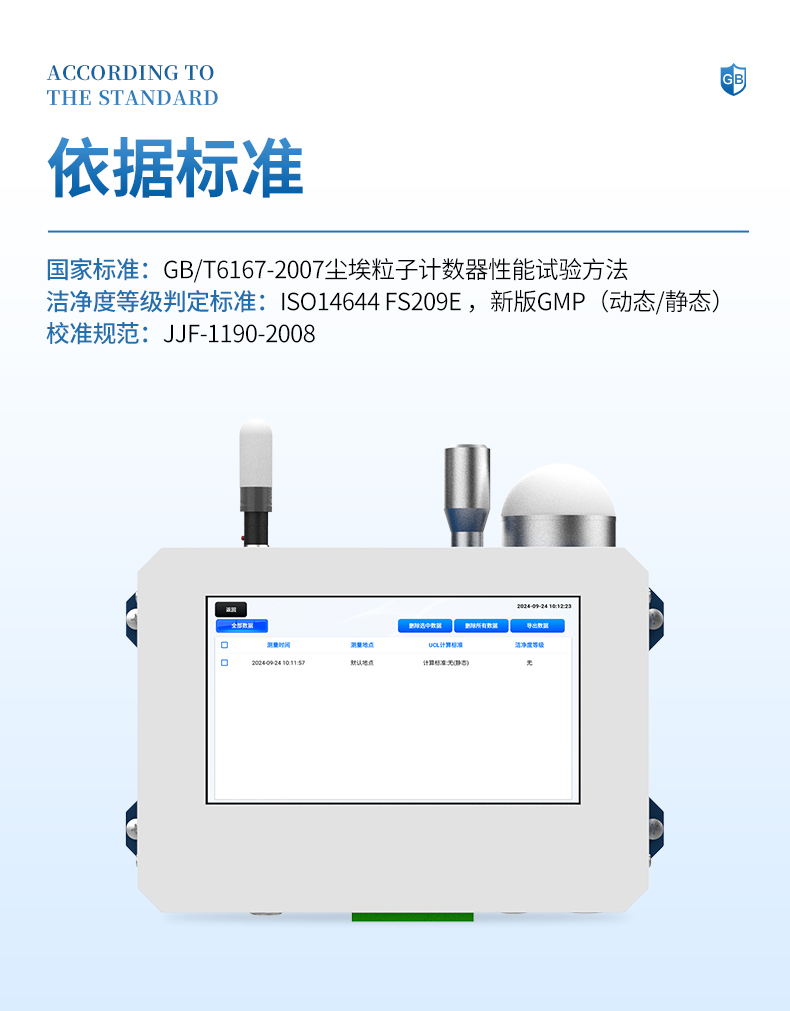智能塵埃粒子計數(shù)器,其置信度測量檢定標(biāo)準(zhǔn)按照國標(biāo)GB/T6167-2007和校準(zhǔn)規(guī)范JJF1190-2008規(guī)定的條件,對凈化級別進行自動判斷。一次采樣可同時測得六個粒徑通道的塵埃粒子數(shù),并同時顯示六個粒徑通道粒子的數(shù)目及其變化情況。