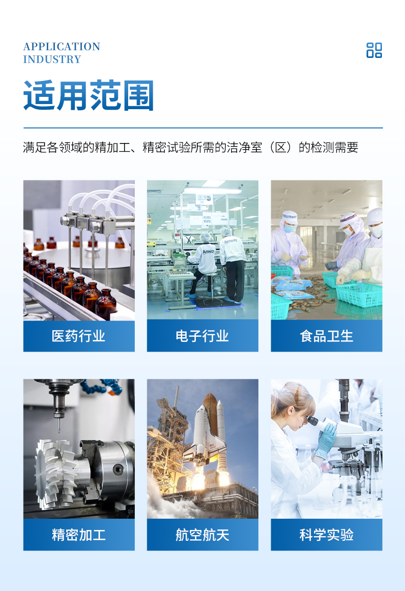 滿足醫(yī)藥行業(yè)(制藥廠、藥檢所、醫(yī)院等);電子行業(yè)(半導(dǎo)體工廠、精密機械的生產(chǎn)加工等);食品衛(wèi)生行業(yè)(乳制品、塑封肉食品、調(diào)味食品、農(nóng)產(chǎn)品等的精加工);過濾器的生產(chǎn)廠家(檢驗過濾器的質(zhì)量及效率等);光學(xué)及航空航天等領(lǐng)域的精加工、精密試驗、生物工程等所需的潔凈室(區(qū))的檢測需要。