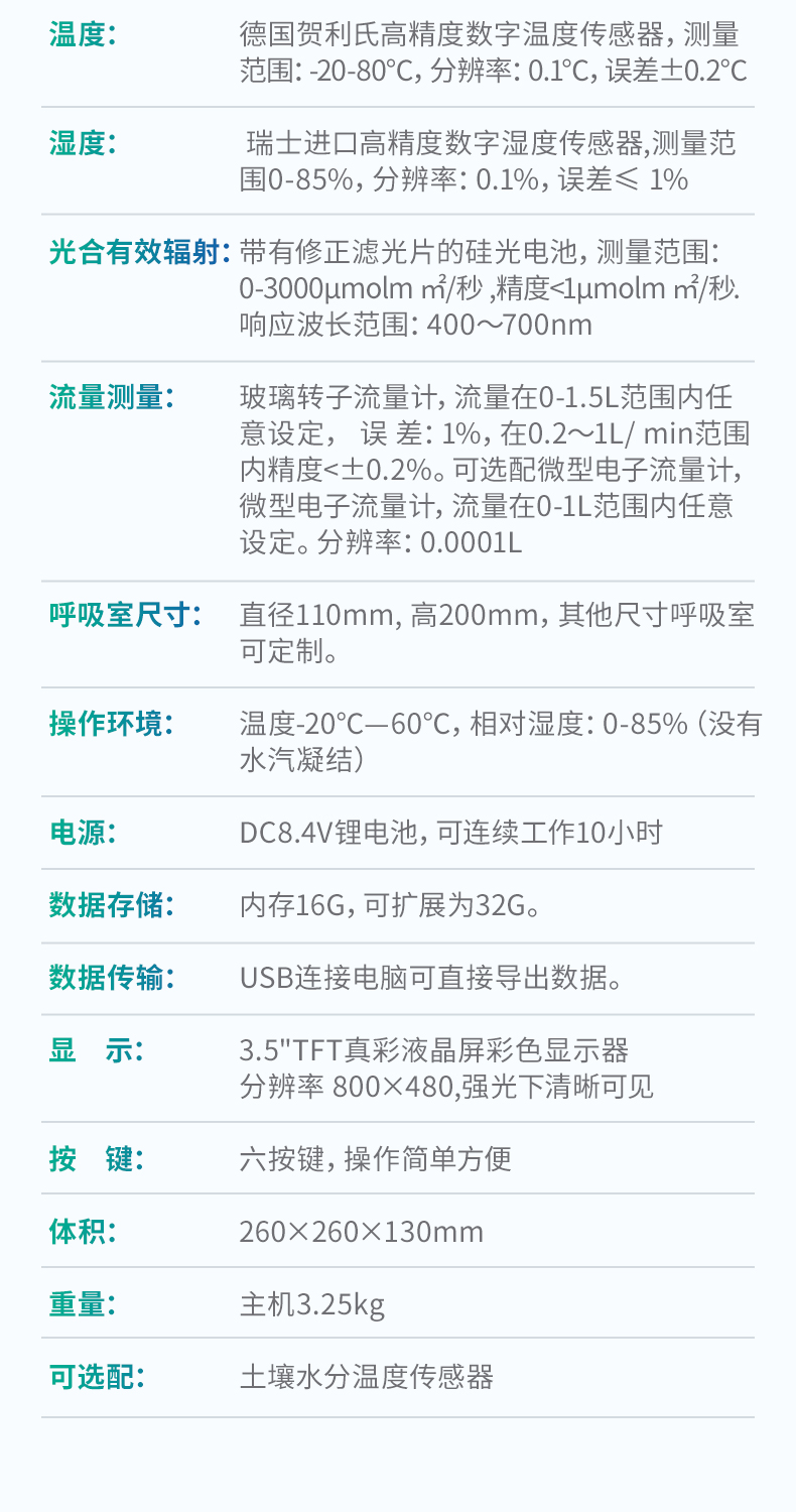 加入了溫度調(diào)節(jié)的雙波長(zhǎng)紅外二氧化碳分析器, 測(cè)量范圍:0-5000ppm,分辨率:0.1ppm; 精度3ppm。二氧化碳測(cè)量不受溫度變化影響,具有穩(wěn)定、精度高,反映靈敏,1秒鐘之內(nèi)就可以完成二氧化碳差值采集。