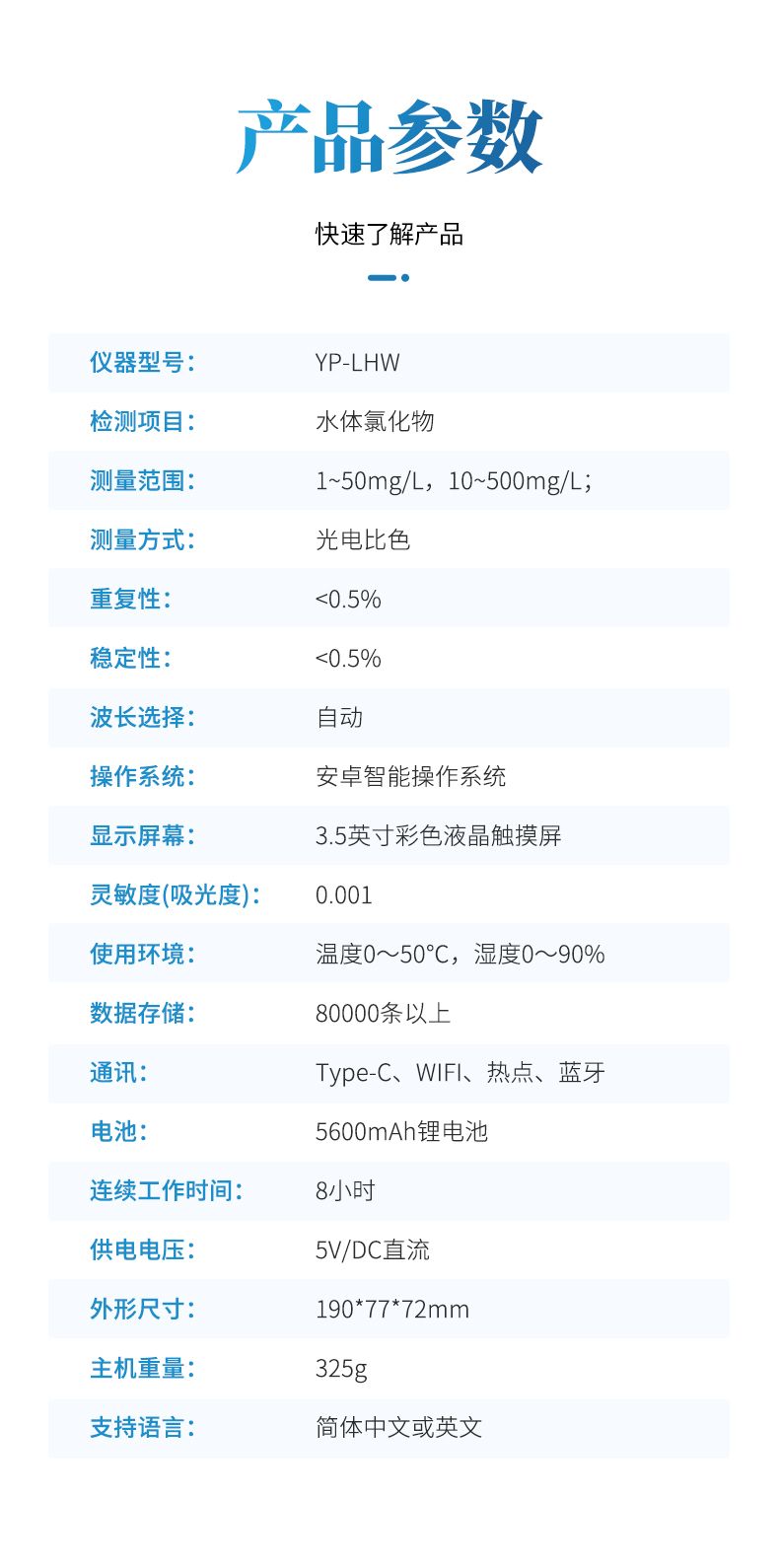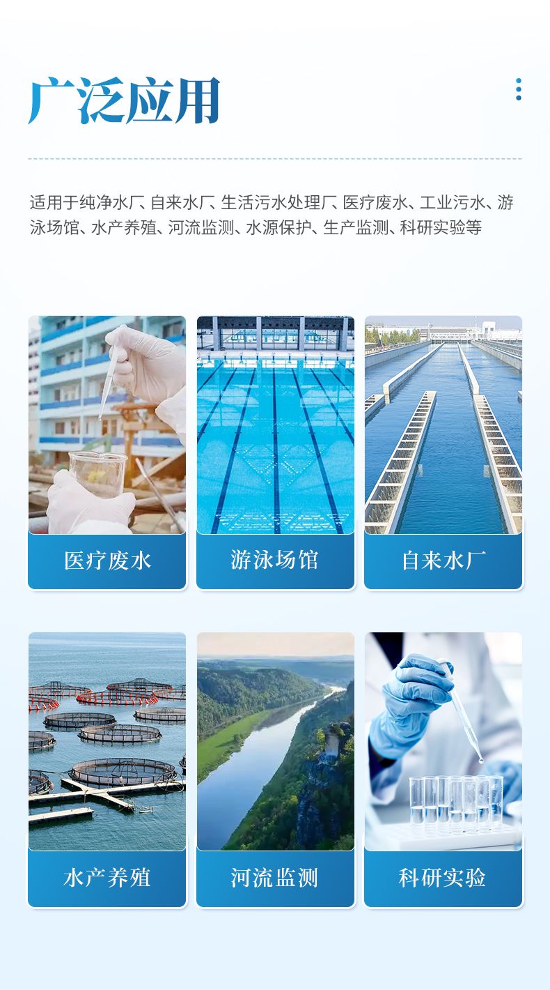 適用于純凈水廠、自來水廠、生活污水處理廠、醫(yī)療廢水、工業(yè)污水、游泳場館、水產養(yǎng)殖、河流監(jiān)測、水源保護、生產監(jiān)測、科研實驗等。