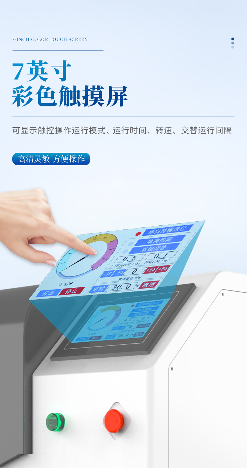 顯示方式:7.0寸彩色液晶顯示屏,可顯示、觸控操作運(yùn)行模式、運(yùn)行時(shí)間、轉(zhuǎn)速、交替運(yùn)行間隔